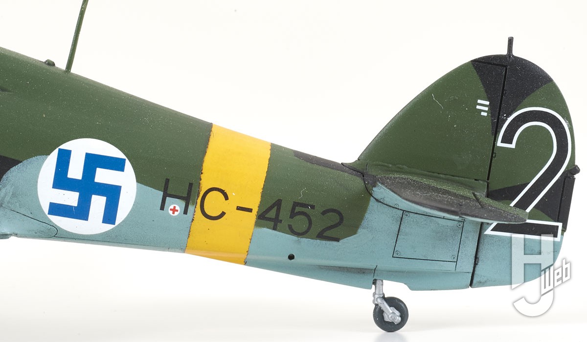 塗装およびマーキングですが、前述したようにフィンランド空軍機で仕上げます。塗装図に掲載されている例1になります。まず機首、胴体後部の帯、主翼下面先端、プロペラ先端の黄色の部分をGSIクレオス Mr. カラーC329で塗ります。黄色で残す部分をマスキングして全体をガイアノーツ サーフェイサーエヴォ ブラックで塗ります。次に下面をMr. カラー C115ライトブルーで塗り、上側面はダークオリーブグリーンと黒の迷彩で仕上げます。このフィンランド空軍のダークオリーブグリーンが難しくキットの指示で調色すると黒との明度差があまり出ません。古い実機の画像でもわりと明度差があるので今回は明るめに調色しました。塗装が終わったらタミヤ スミ入れ塗料黒でスミ入れおよびウォッシングを行い、デカールを貼ります。その後、全体を3/4ツヤ消しクリアーでオーバーコートします。最後に残した小物パーツを取り付けて完成です。