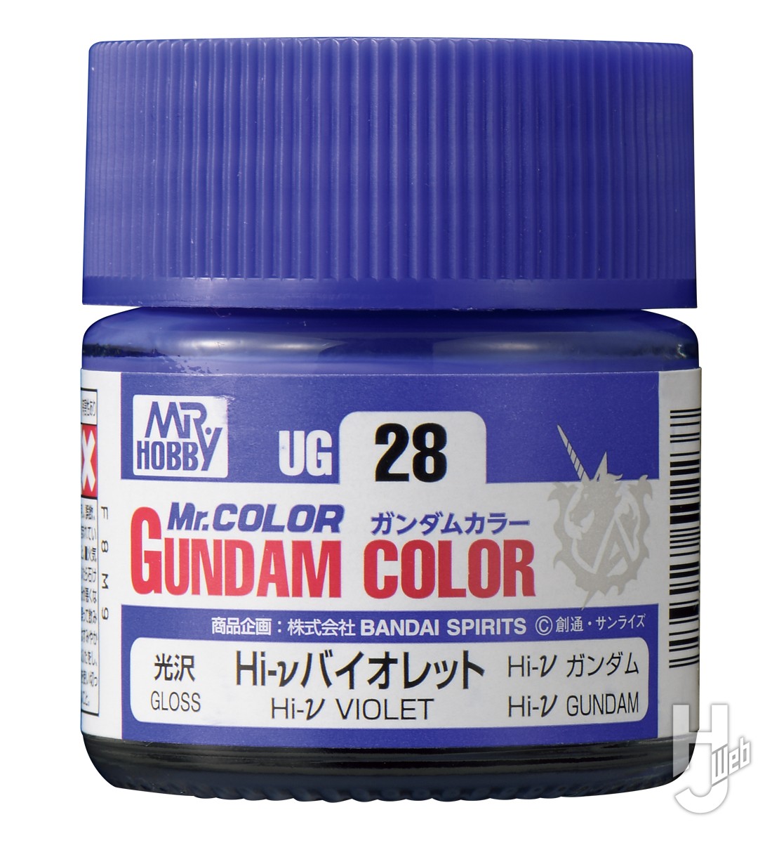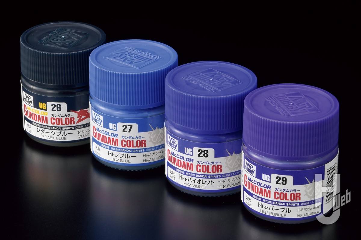 両者の中間的な色となるのが「UG28 Hi-νバイオレット」。これは『SD ガンダムGGENERATION』シリーズなどのゲーム作品に登場するHi-νガンダムのイメージに寄せているとのこと。こういった「赤みのある青」は、実はガンダムカラーには少なく、他でも応用してみたくなる。