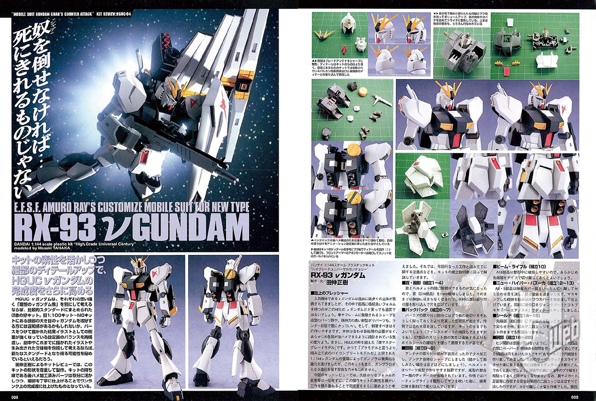 1995年5月のガンキャノンから始まったハイグレードユニバーサルセンチュリー(HGUC)は、着々とそのラインナップを充実させ、ガンプラのスタンダードブランドとしての地位を確固たるものとしていた2008年。シリーズ第86弾としてνガンダムがラインナップされる。その前に、ヤクト・ドーガ2種、ジェガンがリリースされ、いわゆる『逆シャア』熱が高まったところでの登場としてファンの大きな注目を集めた。頭部ヘルメットのスライド金型による一発成型。全6基のフィン・ファンネルの折り畳みギミック再現など、当時のシリーズ集大成とも言える完成度で、ベストセラーキットとして長く愛されるキットとなっている。人気モデラー・セイラマスオも2009年1月号の連載企画「ガンプラLOVE」で製作。今のマスオディテール全開の作例と比べると少し大人しめではあるものの、セイラマスオらしいエッジの利いた仕上がりを披露している。