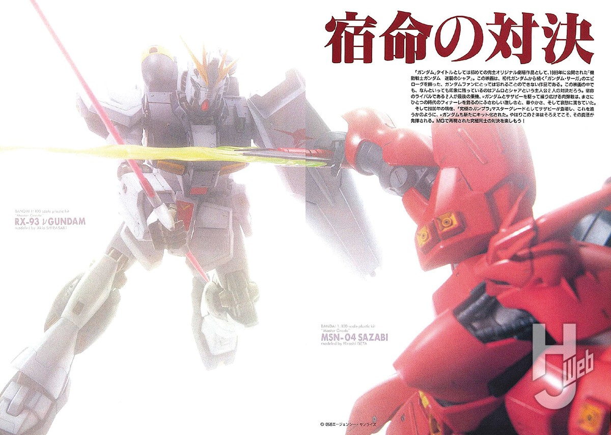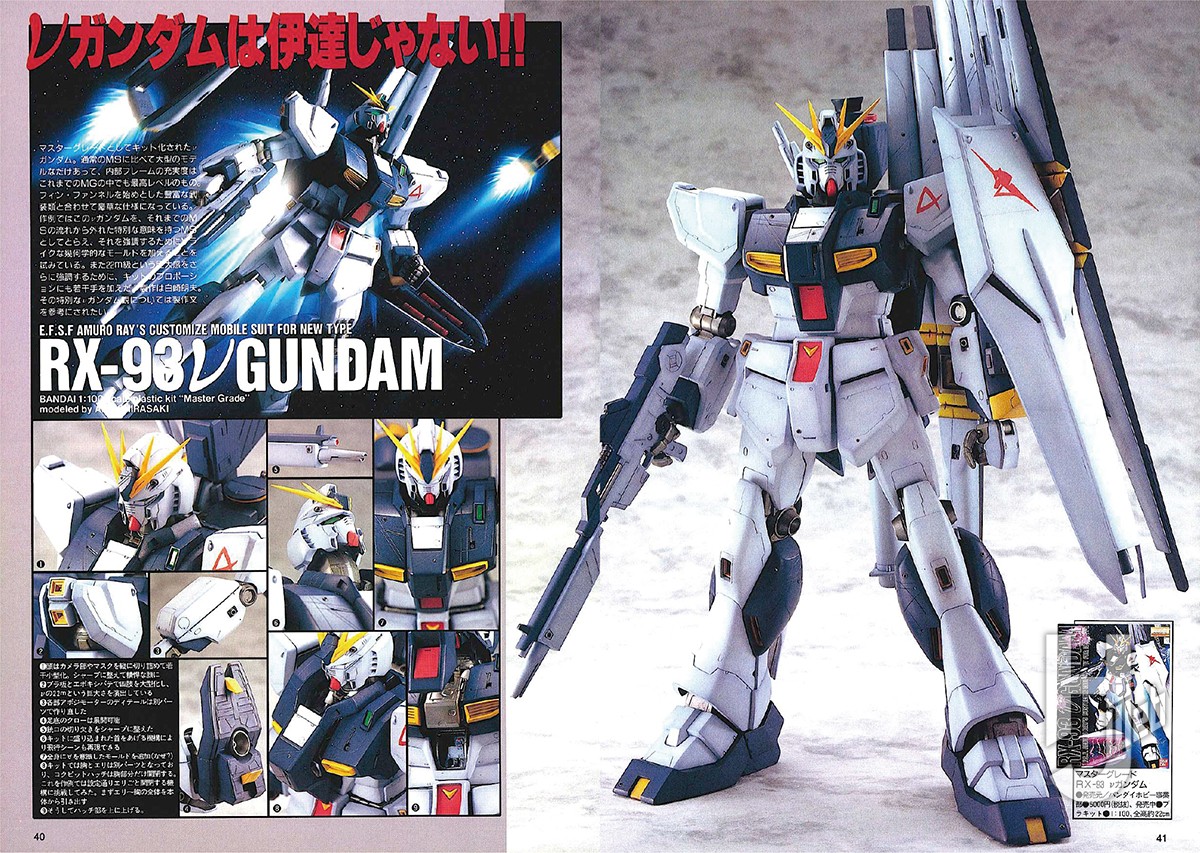 2000年7月のマスターグレード(MG)サザビーに続き、同年12月に満を持して登場したMG νガンダム。月刊ホビージャパンでは発売月となる2001年2月号(2000年12月25日発売)にてキットレビュー作例を掲載。キットの良好なスタイリングはそのままにスケールを鑑みたディテールの追加を行っている。製作は当時活躍していた白崎朗夫氏。清潔感あふれる仕上げが好印象な作品だった。そのおよそ2年後の2003年1月号にて、当時のエースモデラー・伊世谷大士氏による『ガンダムイボルブ5』版のνガンダムの作例が掲載される。一応、MG νガンダム改造となっているが、頭部や上半身を除き、ほぼすべてのパーツがスクラッチと呼べる超大作。スクラッチモデラーとして数々の名作を世に生み出した伊世谷氏だからこそ成し得た究極の職人芸と、当時の誌面でも絶賛されている。MGの登場により、νガンダムの模型表現はさらに幅広く拡大したと言える一幕でもあった。