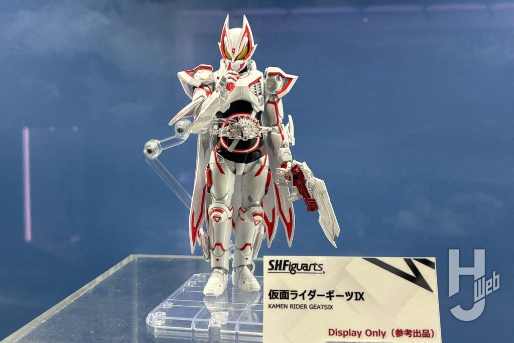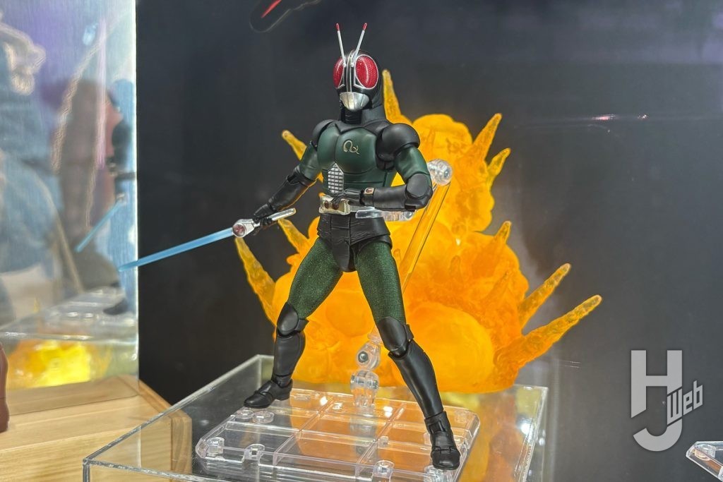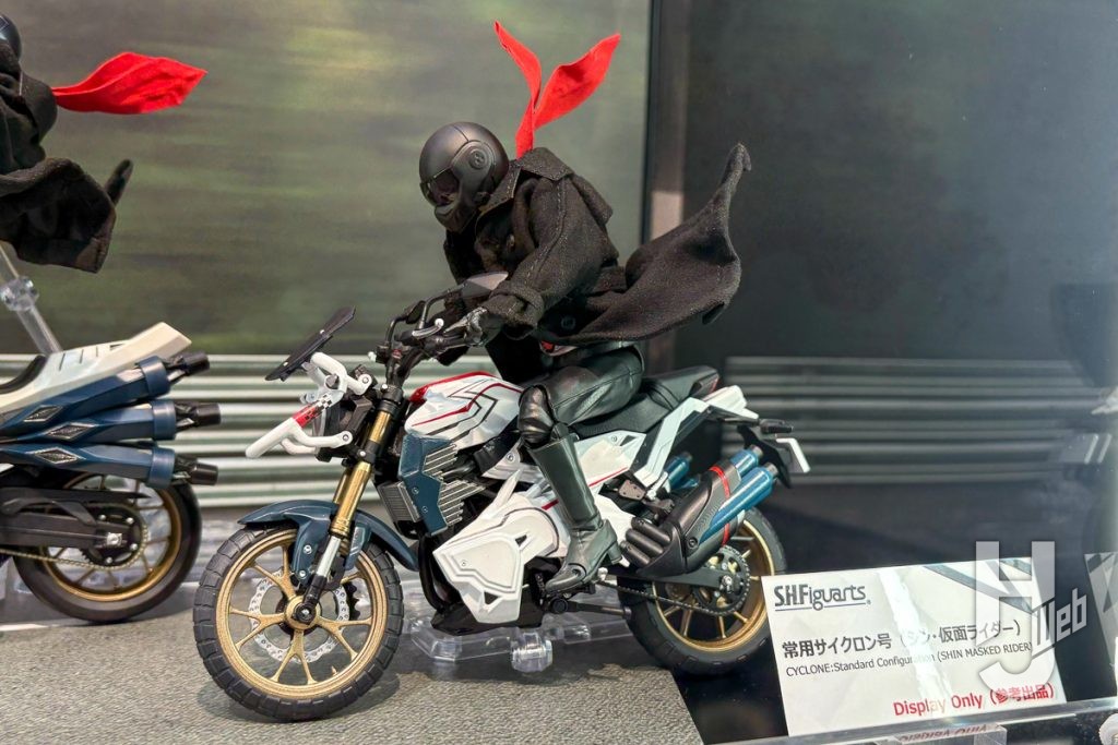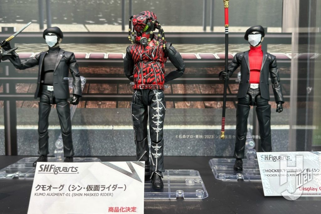 『シン・仮面ライダー』からは「常用サイクロン号」「SHOCKER下級構成員」が参考展示中。そして「クモオーグ」が商品化決定!! 昭和・平成・令和仮面ライダーでは「S.H.Figuarts(真骨彫製法) 仮面ライダーBLACK RX」「イコン画の赤いアギト」の実物展示や「凱火」「仮面ライダーギーツIX」の参考展示が見られる。