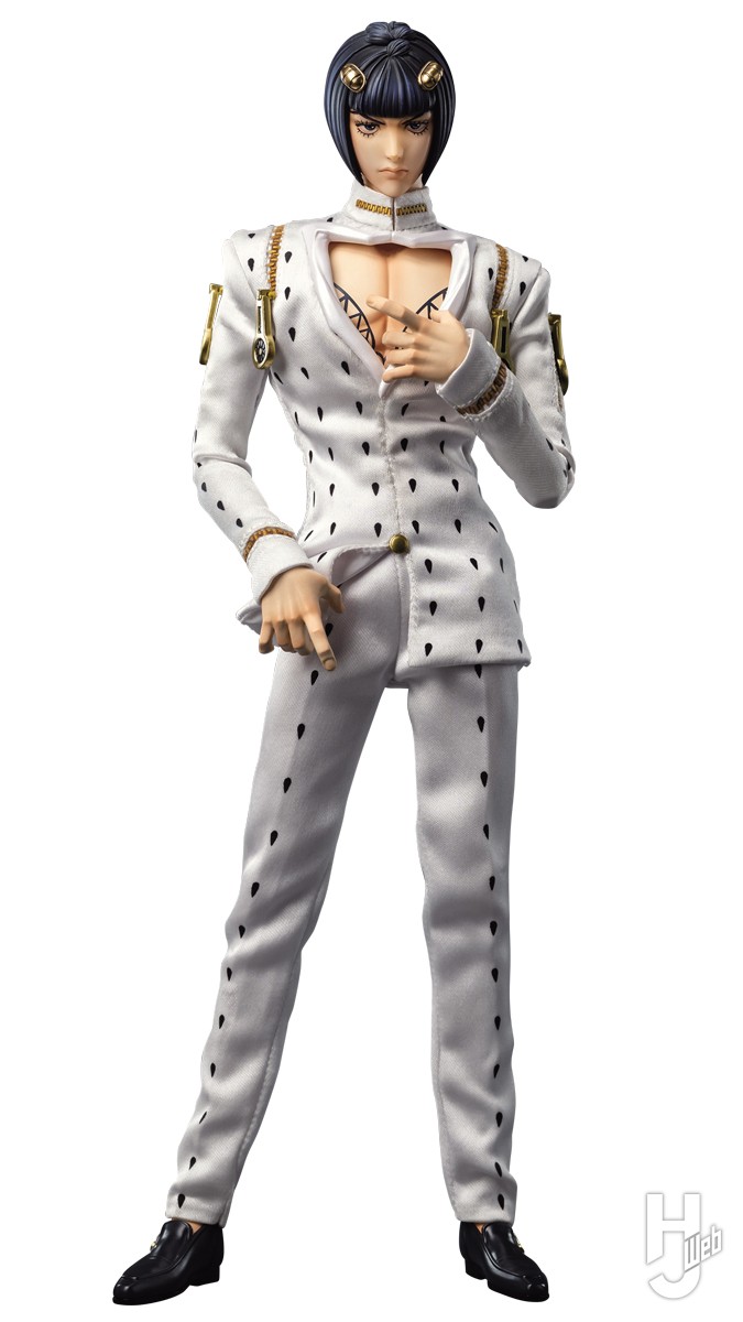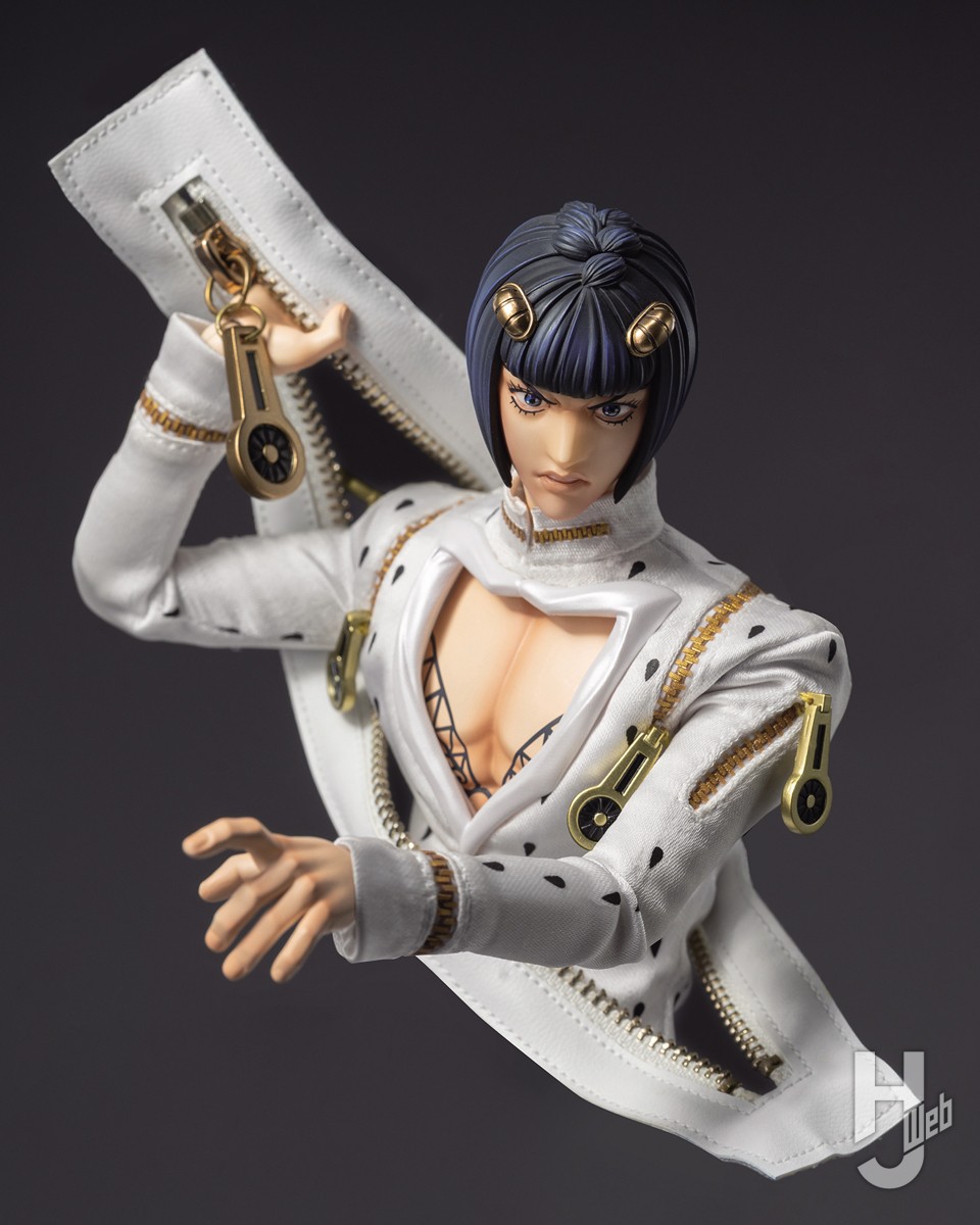 アニメ『ジョジョの奇妙な冒険 黄金の風』のフィグゼロ第2弾はジョルノの盟友ブローノ・ブチャラティ。大型ジッパーは開閉可能で、可動式眼球で目線を調整することもできる。ココ・ジャンボと鍵、携帯電話などシーン再現のための小物も充実しており、まさにこのフィギュアには『スゴ味』があるッ!