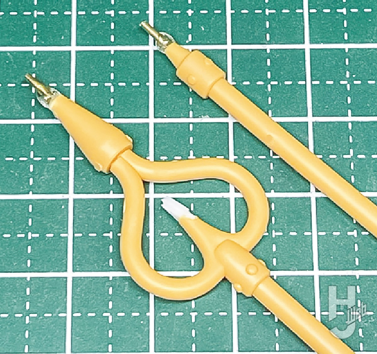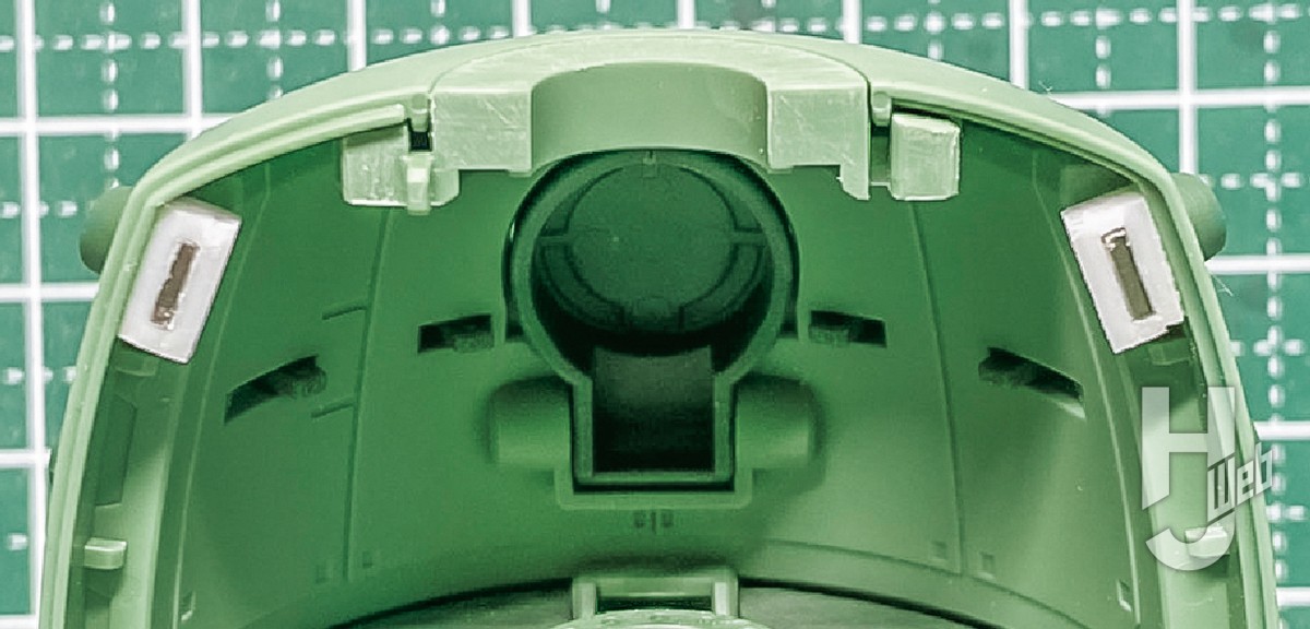 合わせ目消しのための後ハメ加工ですが、釣鐘状の下半身が特殊な構造をしているので少し頭を使います。濃い緑と淡い緑の色分けパーツがすべてはさみ込み式のため、内部の固定リブを削り取って下側からスッポリ外せるように後ハメ加工しました。濃緑のパーツB1-4とB2-4の間の合わせ目が気になったので、接着して合わせ目処理。ここは厚みがほとんど無いので、合わせ目部分の裏側に真鍮線を貼って補強しています。