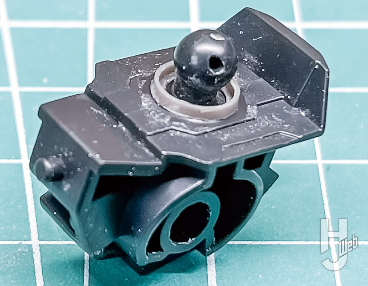股関節は太モモ側の軸にM.S.G丸モールドを加工したスペーサーをかませ、2mmほど延長。内側への可動範囲が広がり、設定画の脚をまっすぐ伸ばした立ちポーズを再現しやすくなります。接続軸を延長する必要がなく、接着しなければ取り外しもできますのでお手軽です。腰も同様にスペーサーをかませ、若干頭身を高くしています。