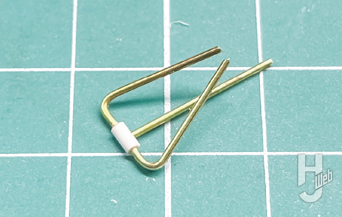 キットではグリップ前方のバーが板状に省略されています。今回は1.6mmプラ棒と0.8mm真鍮線を使って再現しました。設定とデザインは異なってしまいますが、瞬間接着剤が使えるのでハンダ付けも不要、強度もある程度担保できるため、破損リスクも低いかと思います。いかがでしょうか?