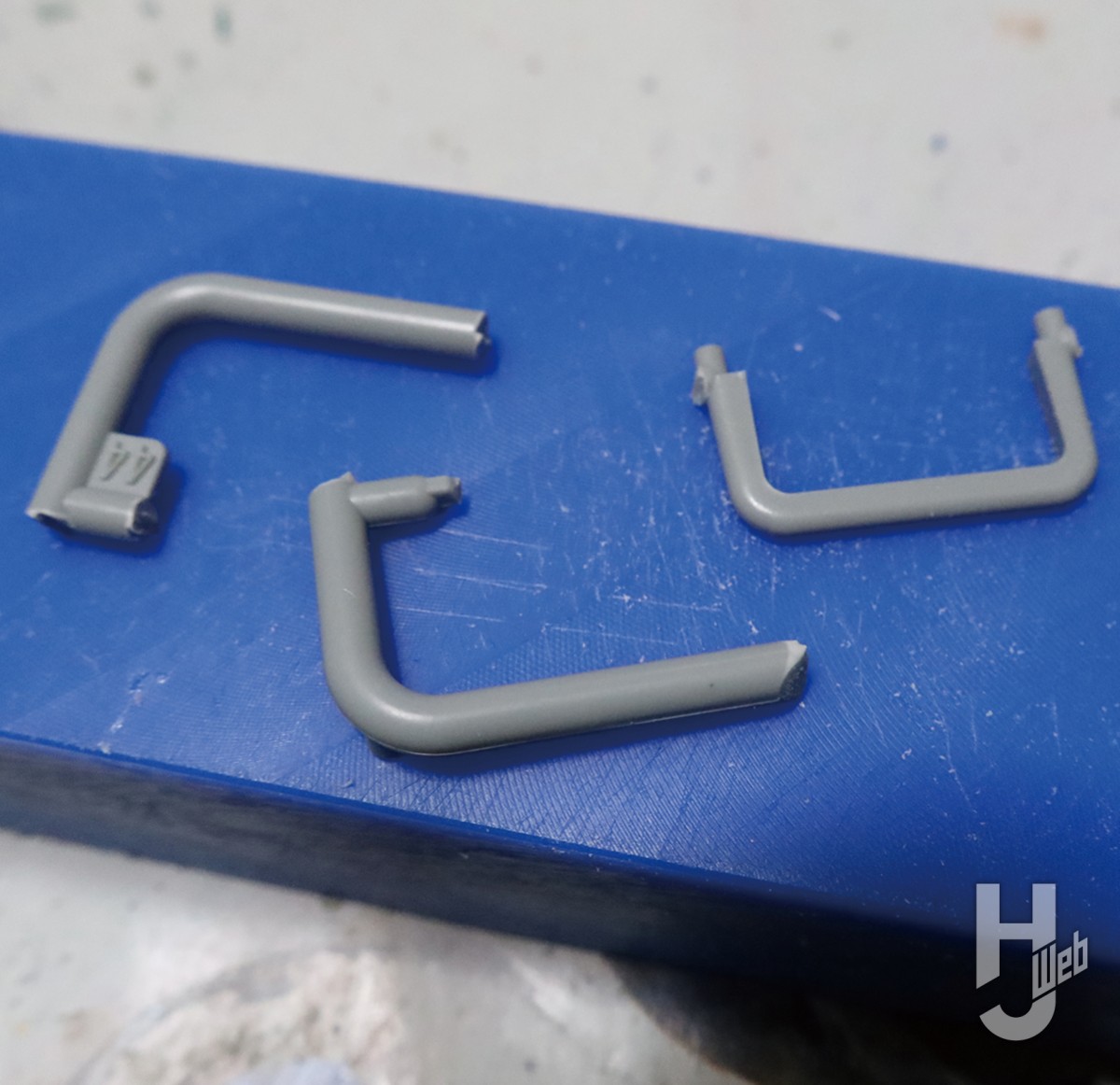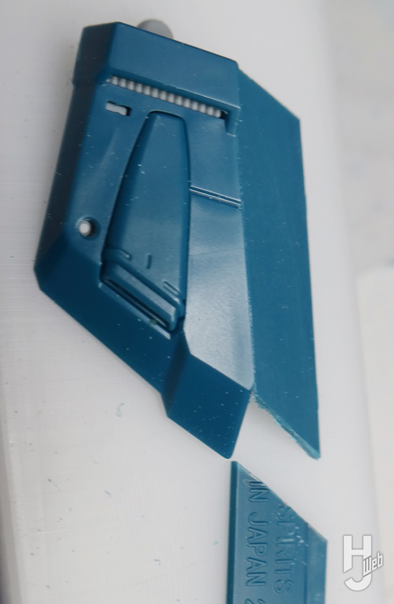 ▲少々きわどいカットになりますが、画像のように切り分けます。キットのこの部分は柔らかめのプラ(通称KPS)でできているので、こういう繊細なカットはカッターで丁寧になぞりながら切り離すと失敗のリスクを低減できます