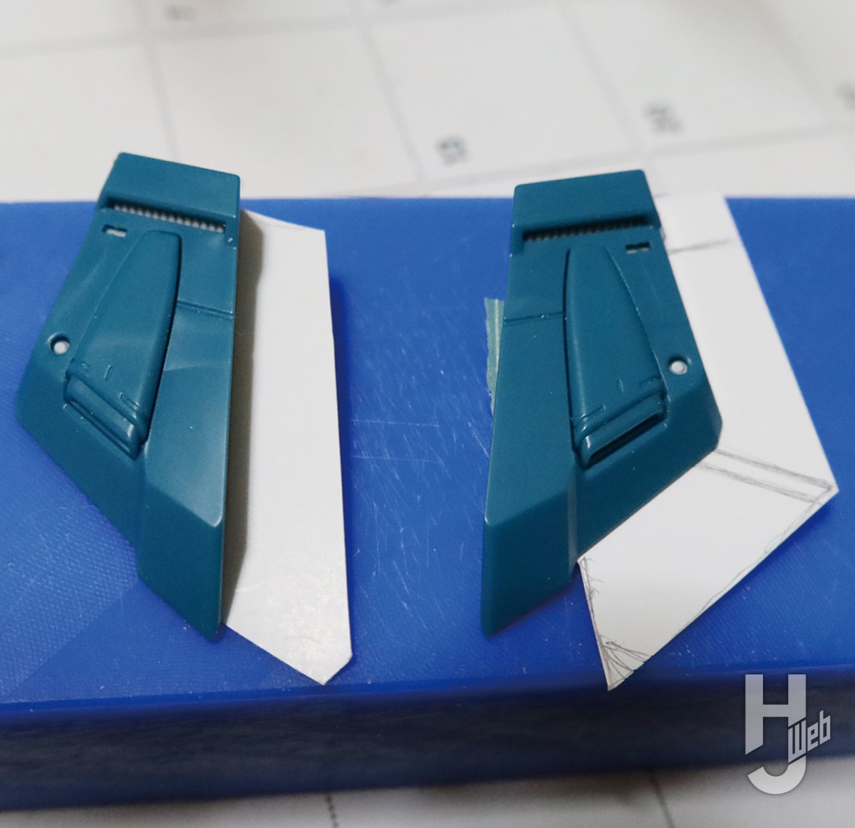 ▲フロントアーマーの形状から、より簡単な方法は内側方向へ延長するほうだと判断。タグプラ板を大胆に貼り付け