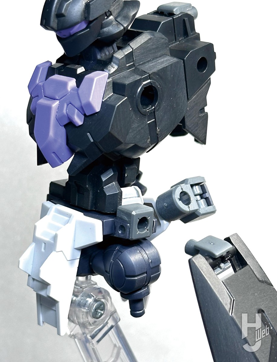 大規模な工作はしていませんが、今回の作例はトゲトゲしいシルエットが特徴なので武装の刀身や翼のクリアーパーツのシャープ化を徹底しました。数が多くなるとなかなか大変な作業ですが、特に翼のクリアーパーツは広げた時のかっこよさがより引き立つので効果は絶大です。また30MMシリーズ定番の3mm穴ですが、前腕部と太モモ部の3mm穴は関節ランナーのジョイントパーツのピンを差し込むことでディテールとして活用しています。