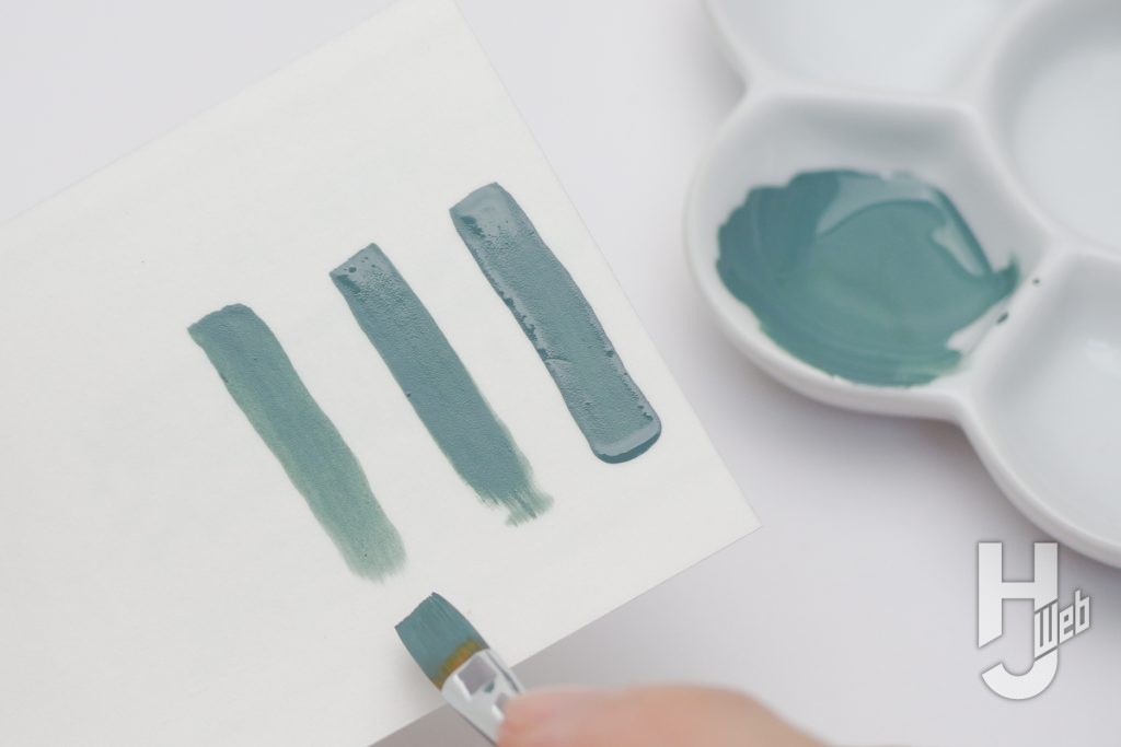 ▲試し塗りをしつつ、筆運びしやすい濃さに調整していきます。一番右は薄めていないものでやや濃い目。うすめ液を少量ずつ加えたのが中央と左。左は筆が運びやすいですが、重ね塗りの必要があります