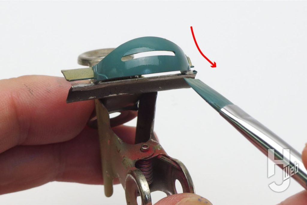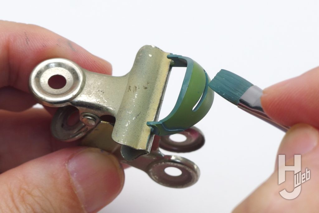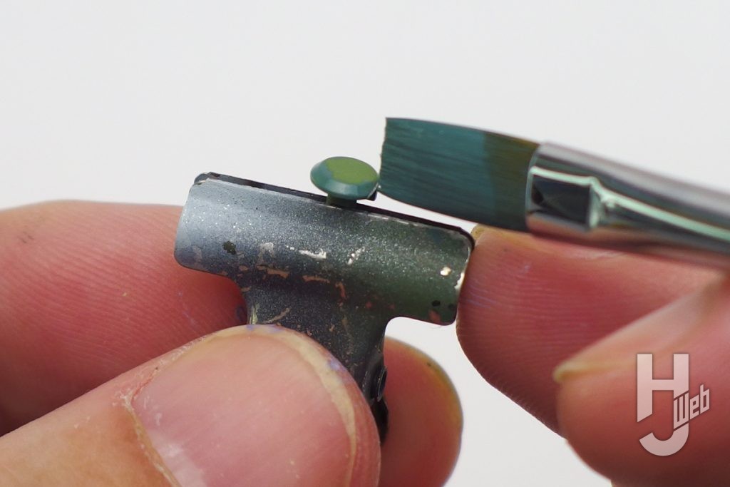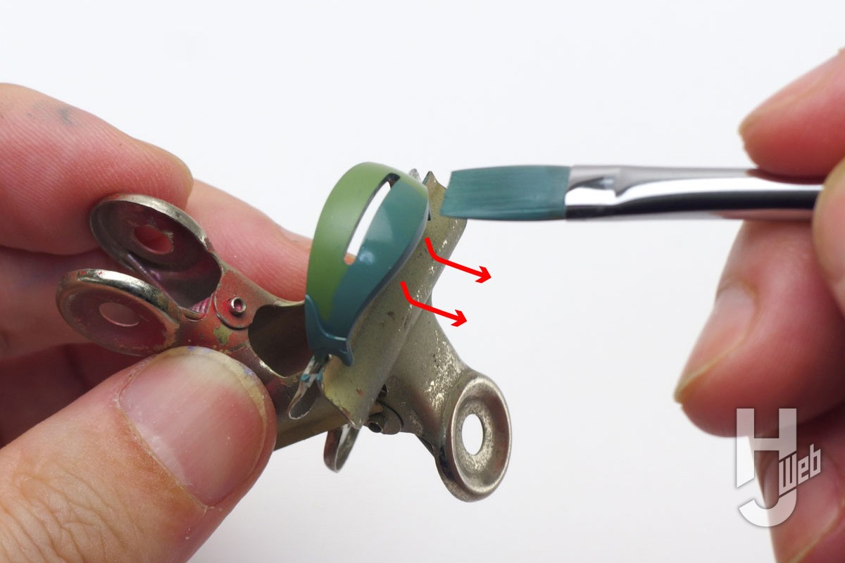 ▲他の細かなパーツも、面ごとに筆を運ぶ向きを変えつつ塗っていくのは同様です。画像はパーツ外周を筆の端で塗っているところで、次に広い平面部を~という順