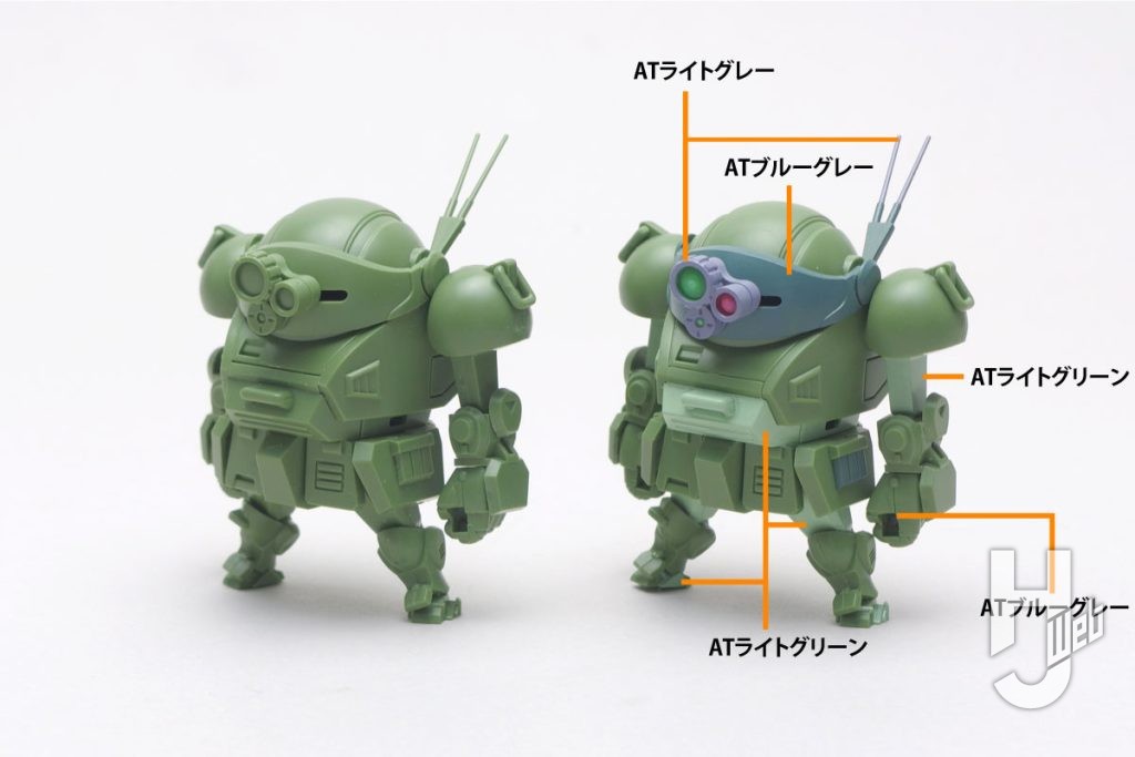 ▲スコープドッグの標準的な機体色5種の水性ホビーカラー。アニメの色を再現した半光沢仕上げ。今回はこの中からATライトグリーン、ATブルーグレー、ATライトグレーの3色を使用します