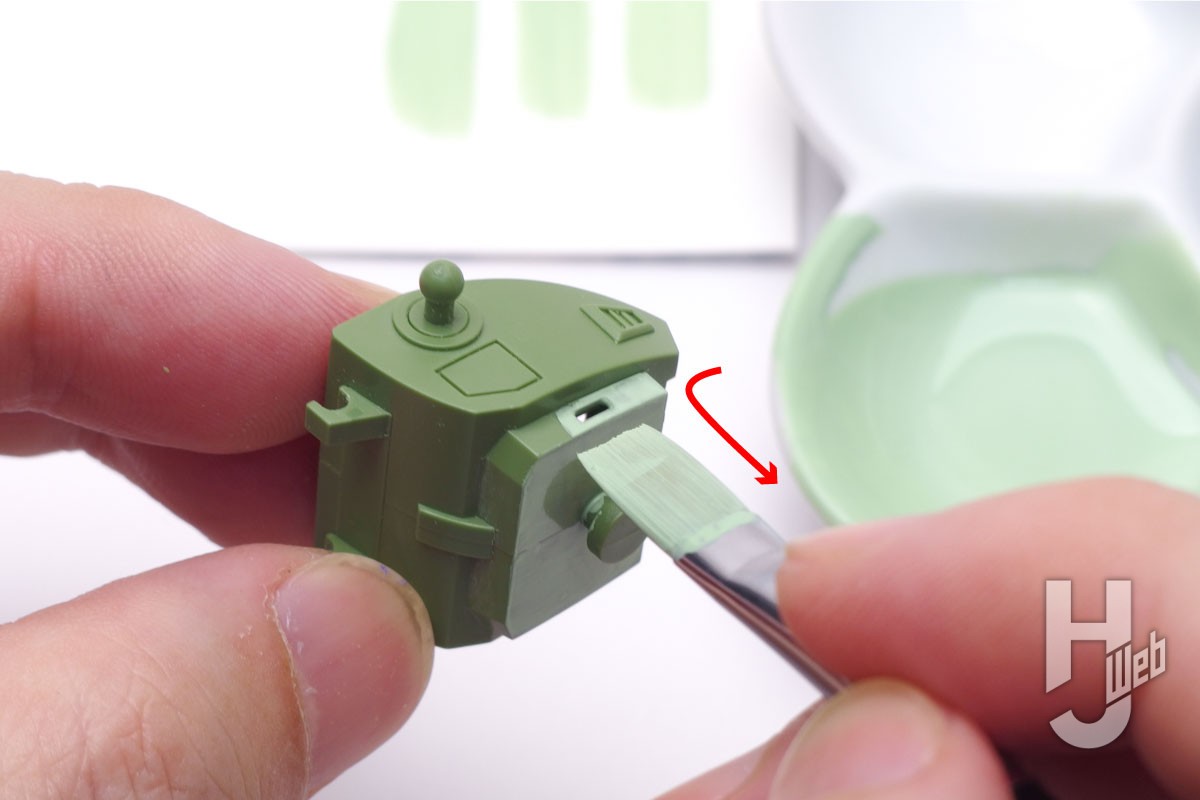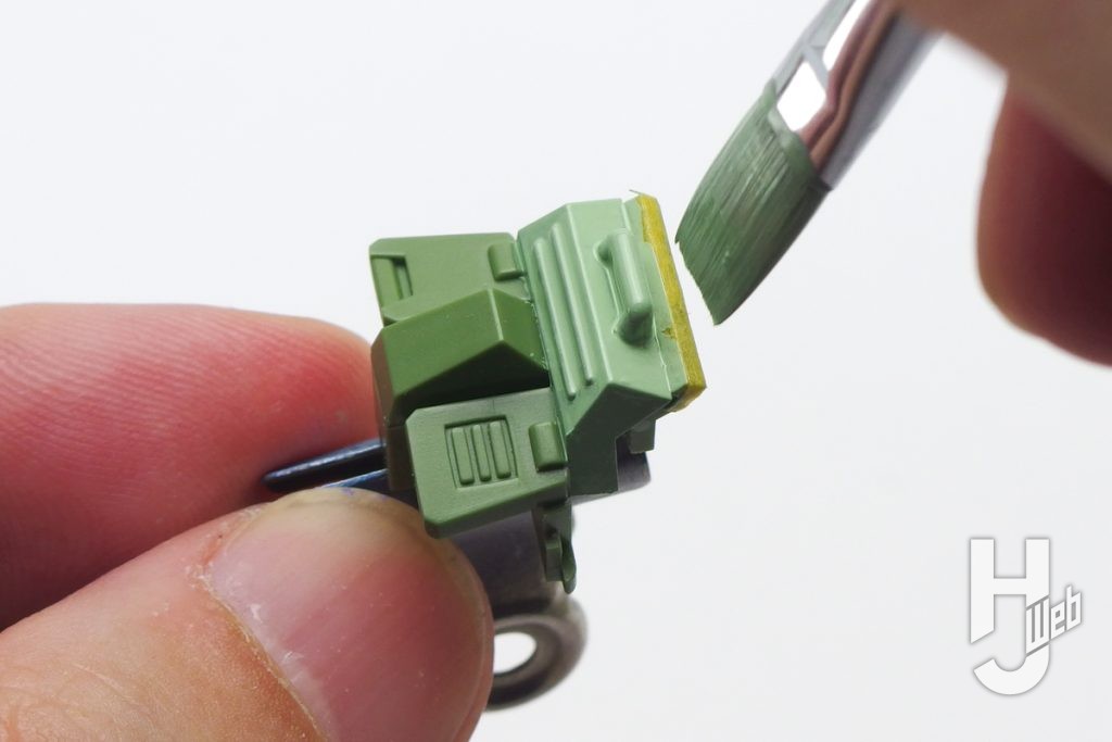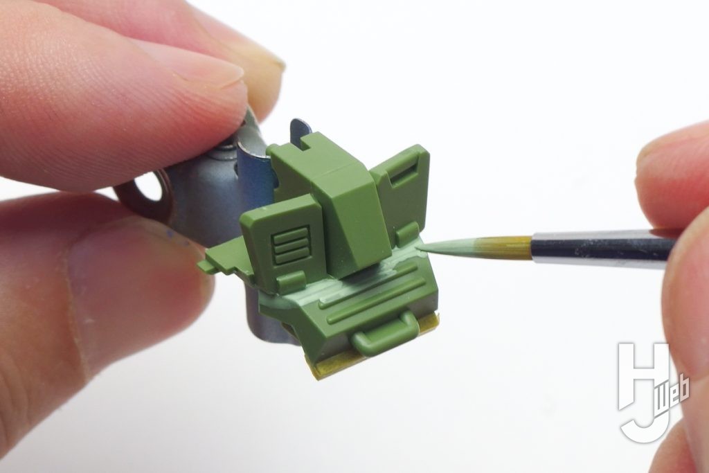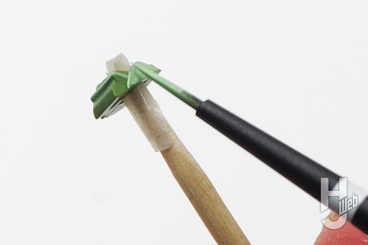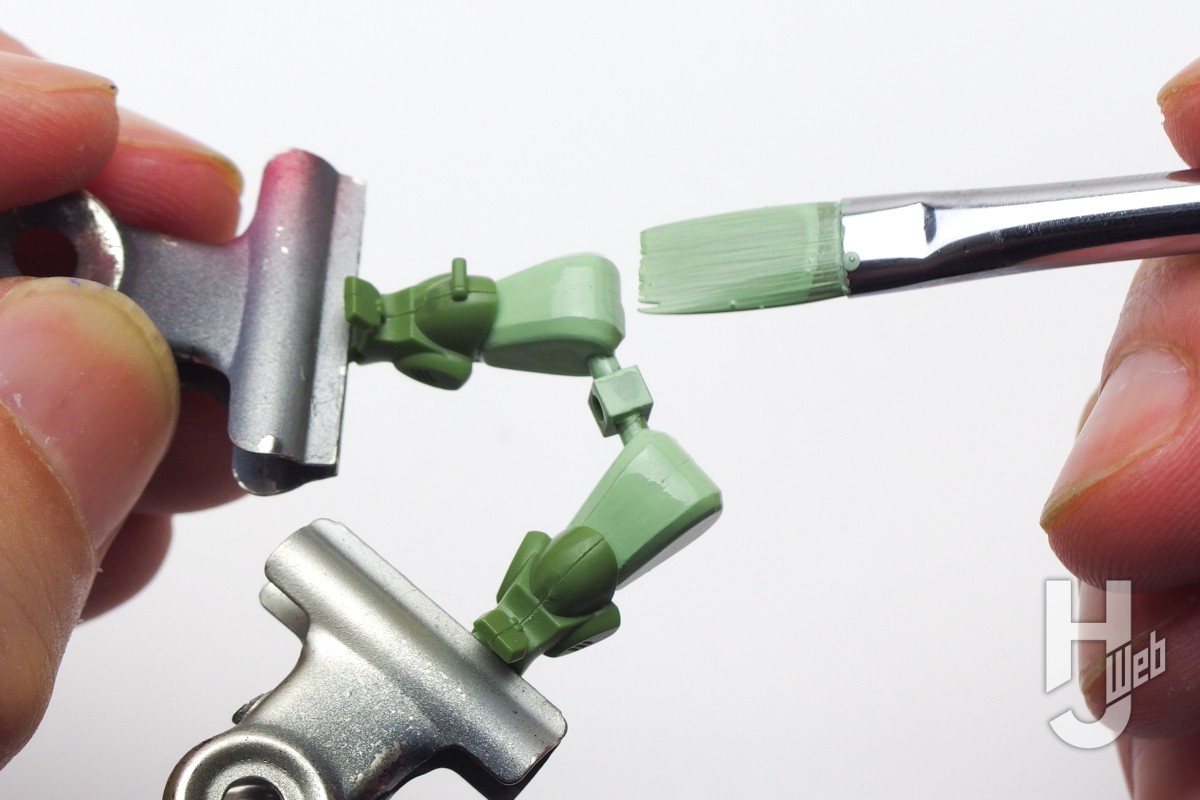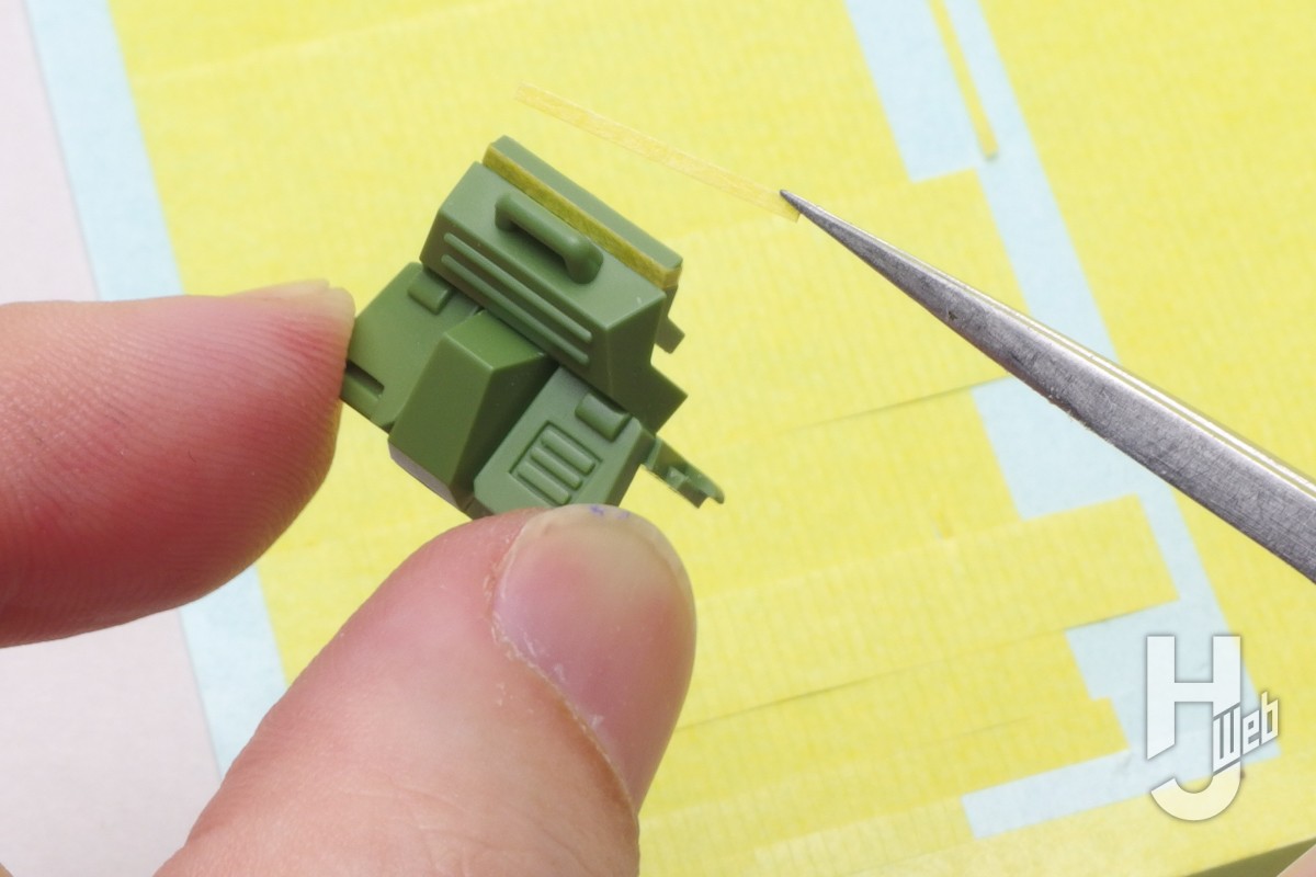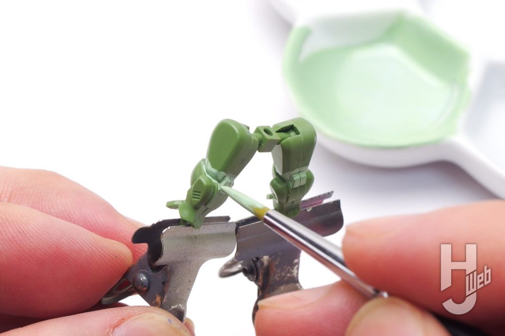 胴体や脚部をATライトグリーンに塗り分けるところで、パーツ途中で塗り分ける方法を紹介していきます。境界はテープなどでマスキングする方法もありますが、場所に応じて手軽で効果的な方法を使い分けて対処してみます。