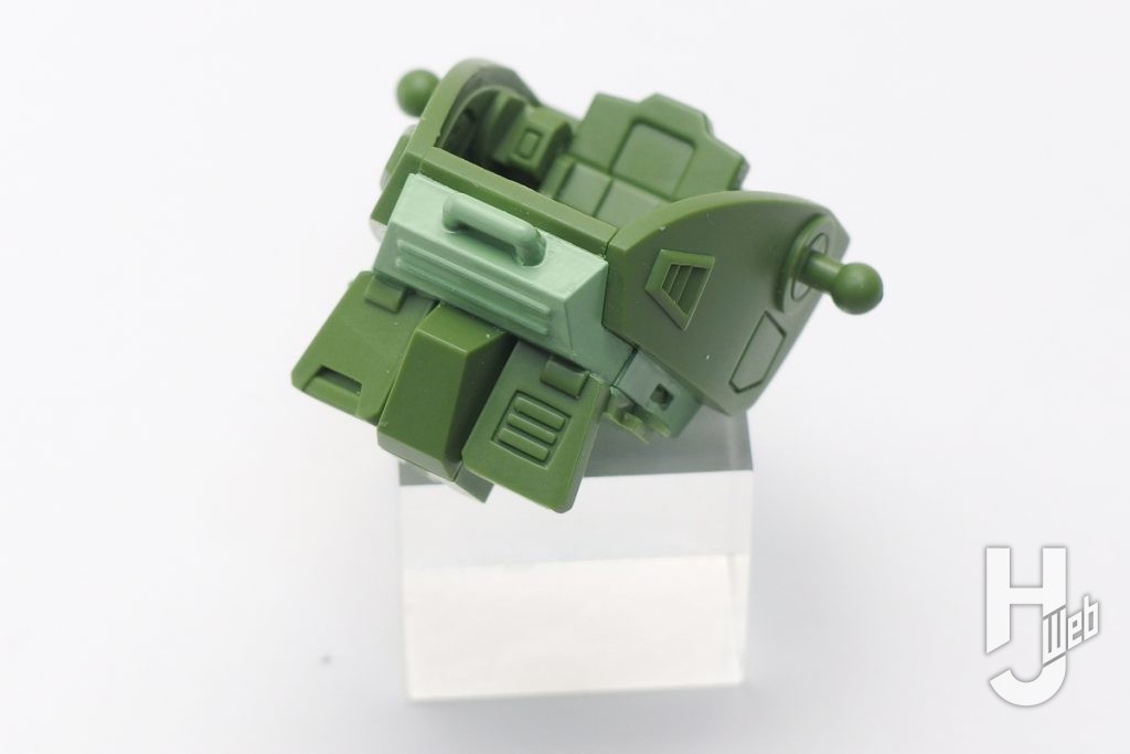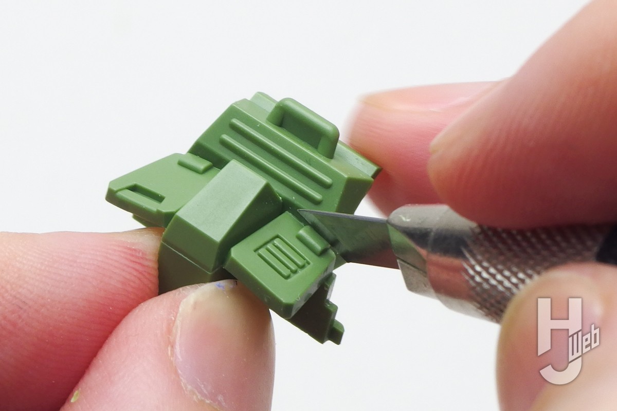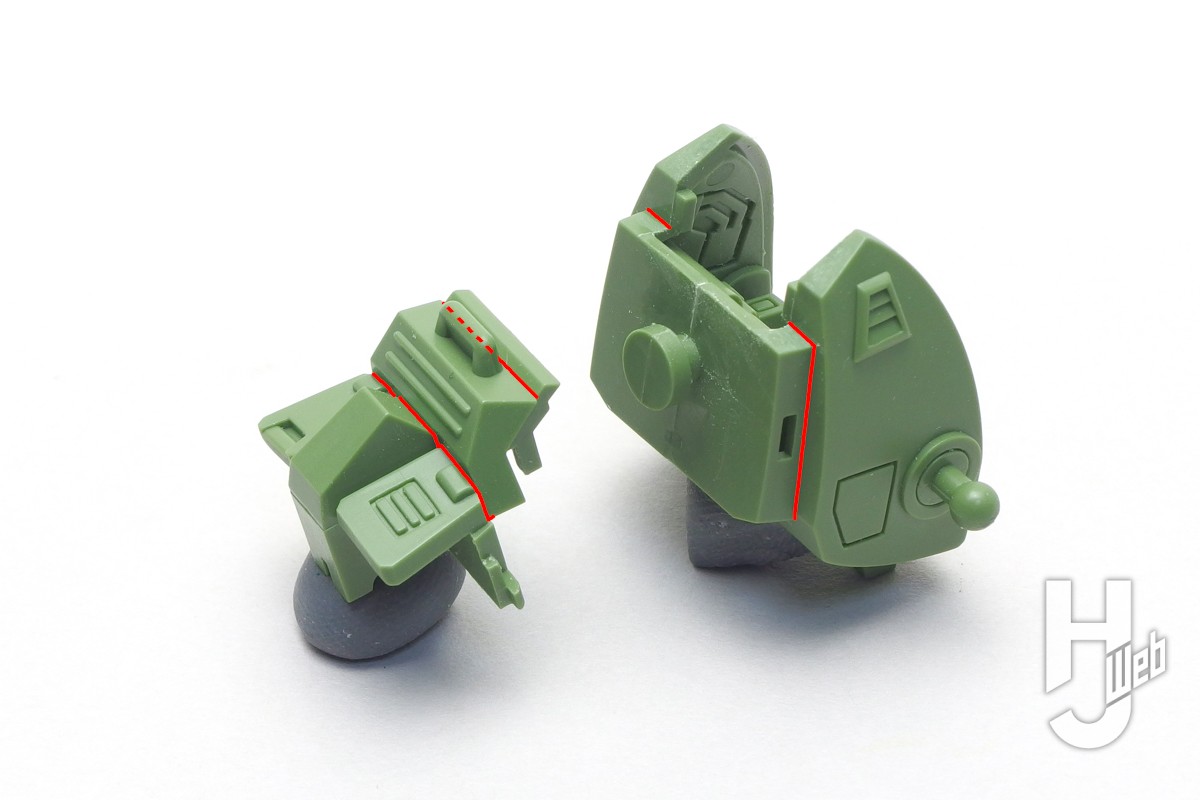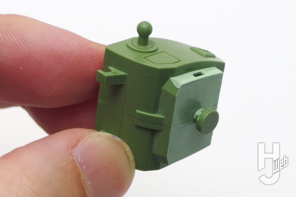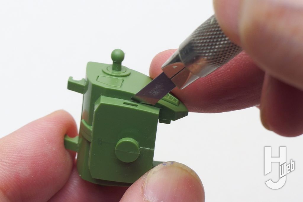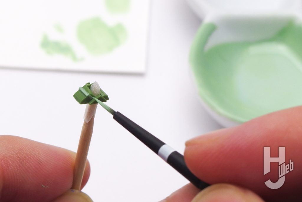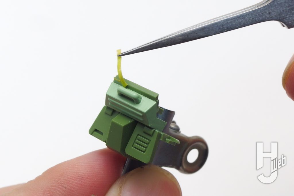 胴体や脚部をATライトグリーンに塗り分けるところで、パーツ途中で塗り分ける方法を紹介していきます。境界はテープなどでマスキングする方法もありますが、場所に応じて手軽で効果的な方法を使い分けて対処してみます。