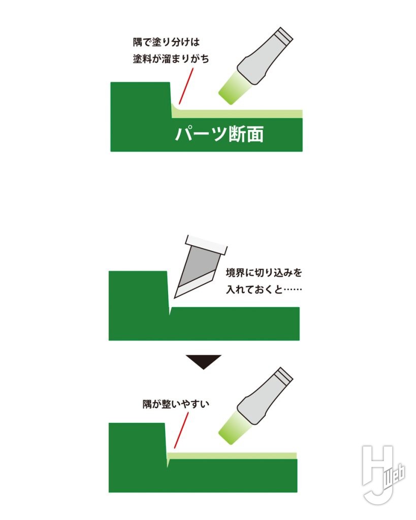 ▲隅での塗り分けは塗料が溜まりやすく、そのままでは区切りがシャープになりにくいです。そこにナイフで浅く切り込みを入れておくと、塗料が切り込みに沿うようになり、ハミ出しや厚くなるのを抑える効果があります