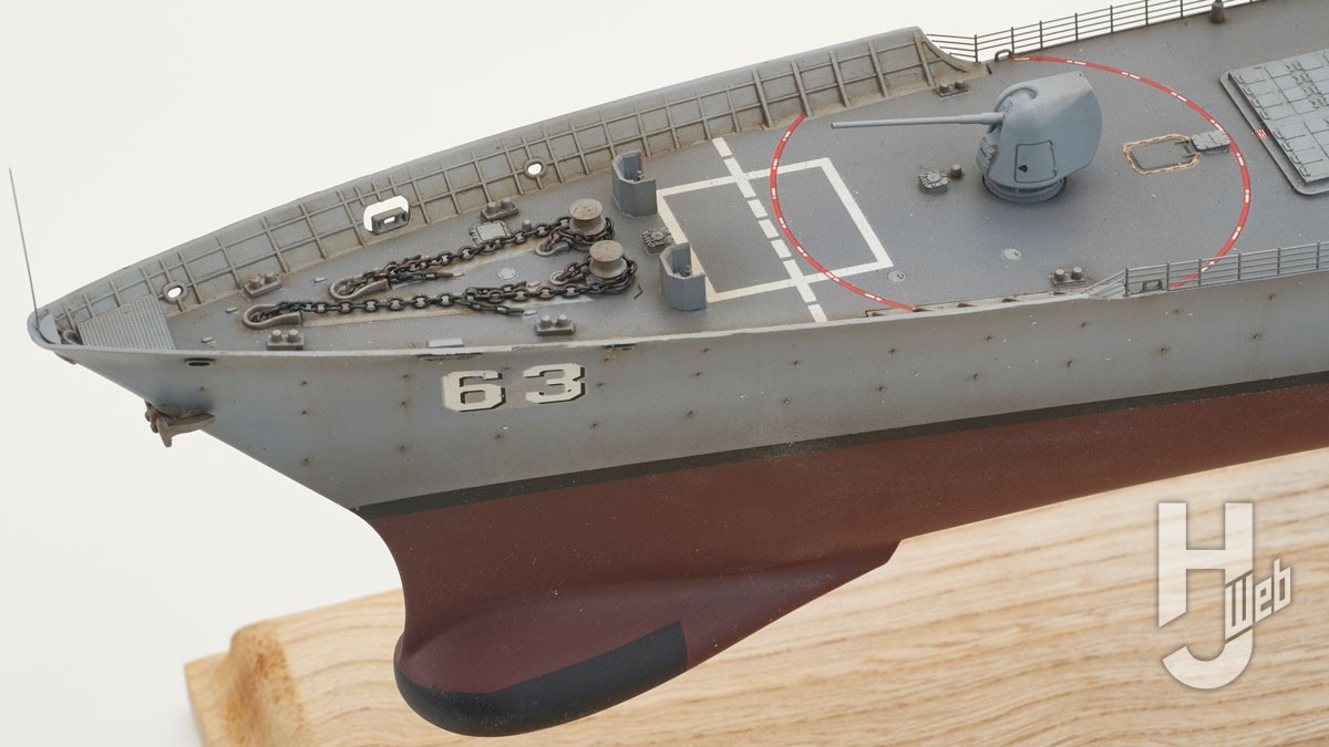 次に手すり以外のエッチングパーツ類を壁面部分にモリモリ接着していきます。3Dプリントパーツにはサーフェイサーを塗装して船体色で塗装します。船体ですが、艦底色を塗装したらマスキングして船体色を塗装します。乾燥したらすべてのマスキング撤去して3Dプリントパーツと残りのエッチングパーツを接着していきます。3Dプリントパーツは非常に壊れやすく繊細なので、慎重にニッパーで切り出しましょう。デカールを貼ったらタミヤ スミ入れ塗料でスミ入れと汚しを施します。これが終わったらマストを接着して、今度はサビ表現を油絵具で加えていきます。実物は意外とサビていますがくどくならない程度にしておきます。最後に貼り線をしてツヤ消しクリアーでコーティングで完成です。