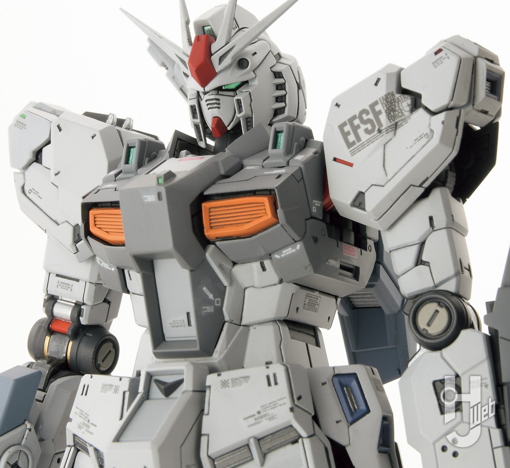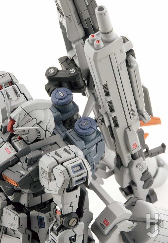 プロポーション変更はしていませんが、唯一首のジョイントを1mmほど短くして取り付けを気持ち後方へ移動。首の上面前部分とフェイスのアゴ裏を削って、アゴを引けるようにしています。本体および装備類はディテールを追加しつつ、スケールなりのシャープさを演出するべくエッジや面の処理を行っています。