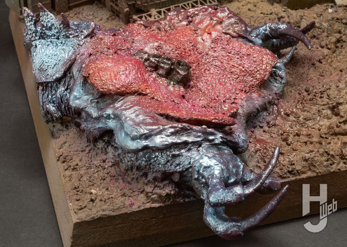 今回は『ゴジラ2000 ミレニアム』のラストをイメージしてA3程度の厚さ15mmのベニヤ板を使いスクラッチしたビルや破壊されたオルガを配置していくぞ。オルガは下絵を描き、アルミホイルで大まかな形を作るんじゃ。このときは頭を破壊されて背骨が見えるイメージじゃったのと、大きな爪を見せたかったから下半身は無い状態じゃ。だいたいのアルミホイルフレームができたら、紫外線硬化パテを使い部分別に表皮を作り硬めながら全体のバランスを見て進めていくぞ。紫外線硬化樹脂パテは嫌な臭気もなく、アルコールで表面をならすこともできるので、リビング等での模型製作にもピッタリじゃ。オルガが爆発して飛び散った表現は、熱で硬化する樹脂粘土のスカルピーを使って造形した。ヒートガンという高熱源のドライヤーを使い、あえて表面につぶつぶが浮いて焦げるくらい熱してやることで生物感を表現してみたぞ。