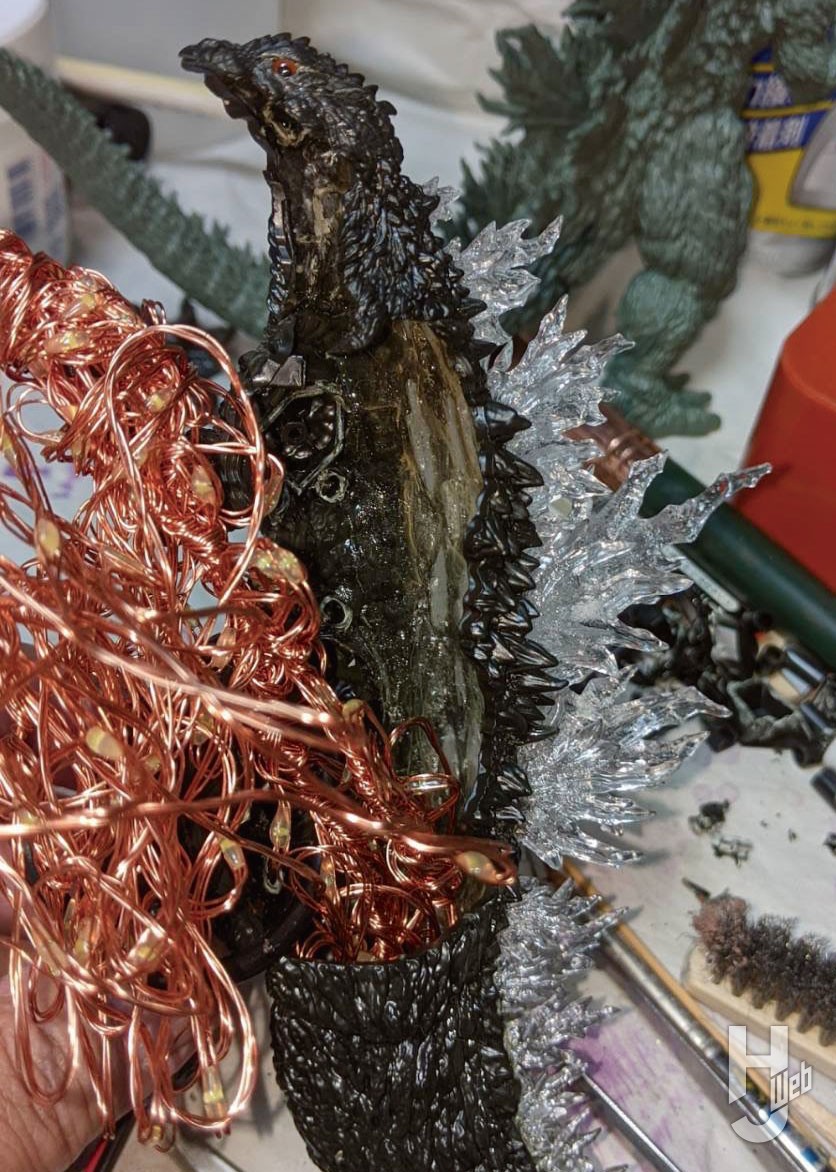 ネットショップ限定版にはクリアーパーツの背ビレが付属するので、これを利用して電飾版ゴジラも作るぞ。電飾版は、変速的な作り方をしたから注意してほしいぞ。それは中身の芯材を使わず外側のパーツだけを貼り合わせるというものじゃ。これで中身を中空にするんじゃが、一度に組み立てず半身になるようにして電飾パーツを組み込んでいくぞ。ポイントは背ビレパーツを組み立てる差し込み部位を大きく広げること。これで光が伝わりやすくなるんじゃ。光らせるユニットはクリスマスの時期に売られているLEDラインモールで米粒大電球色が100個あるものを体内に入れ込んだぞ。配線は右足裏にあけた穴から逃がしてあるんじゃ。さらに今回はゴジラの口中を光らせるために上下アゴパーツを型取りし、紫外線硬化樹脂を使って透明化もしてあるぞ。