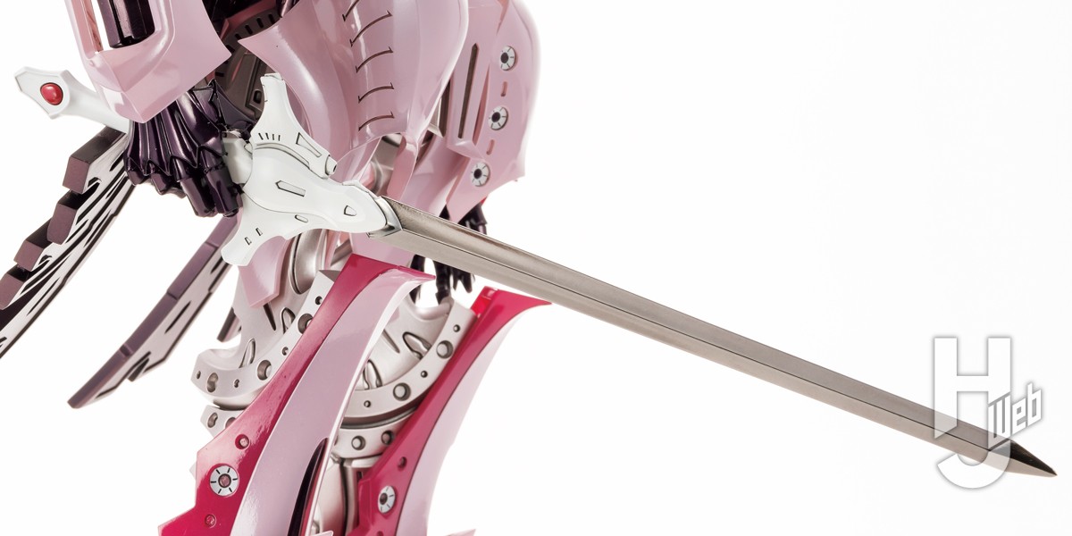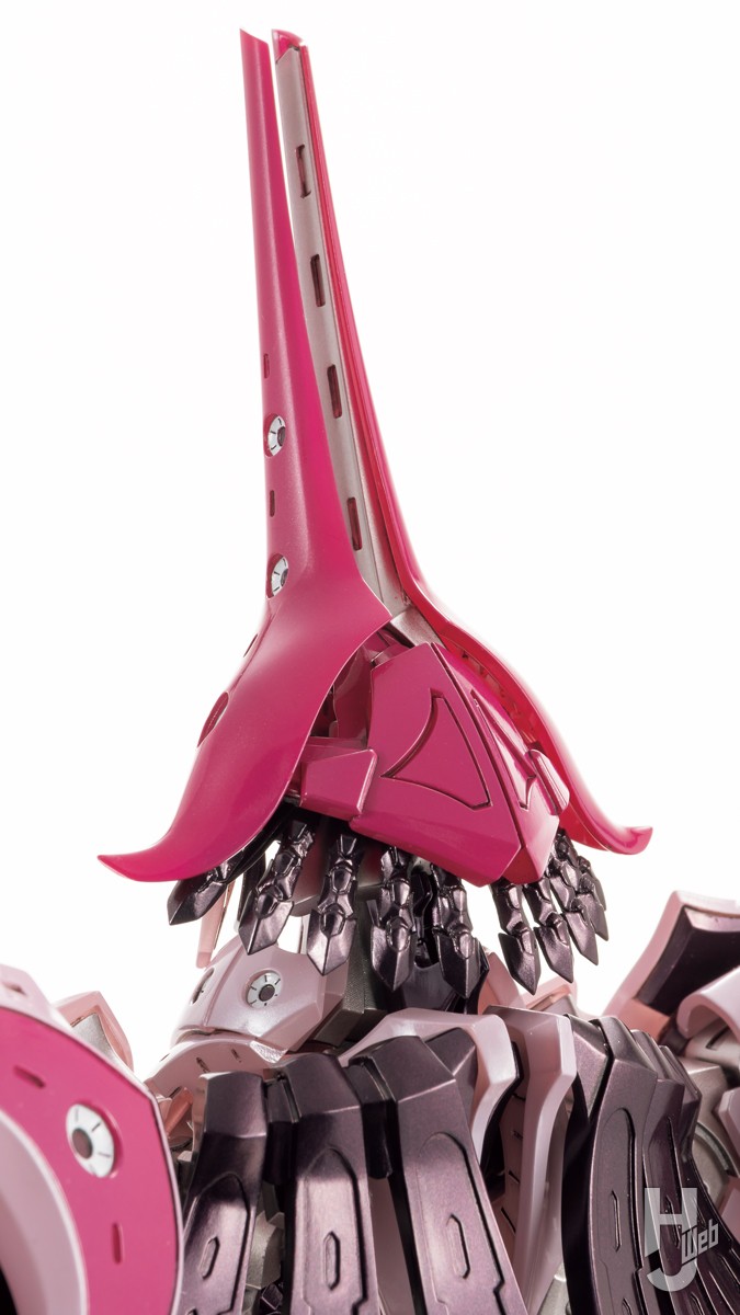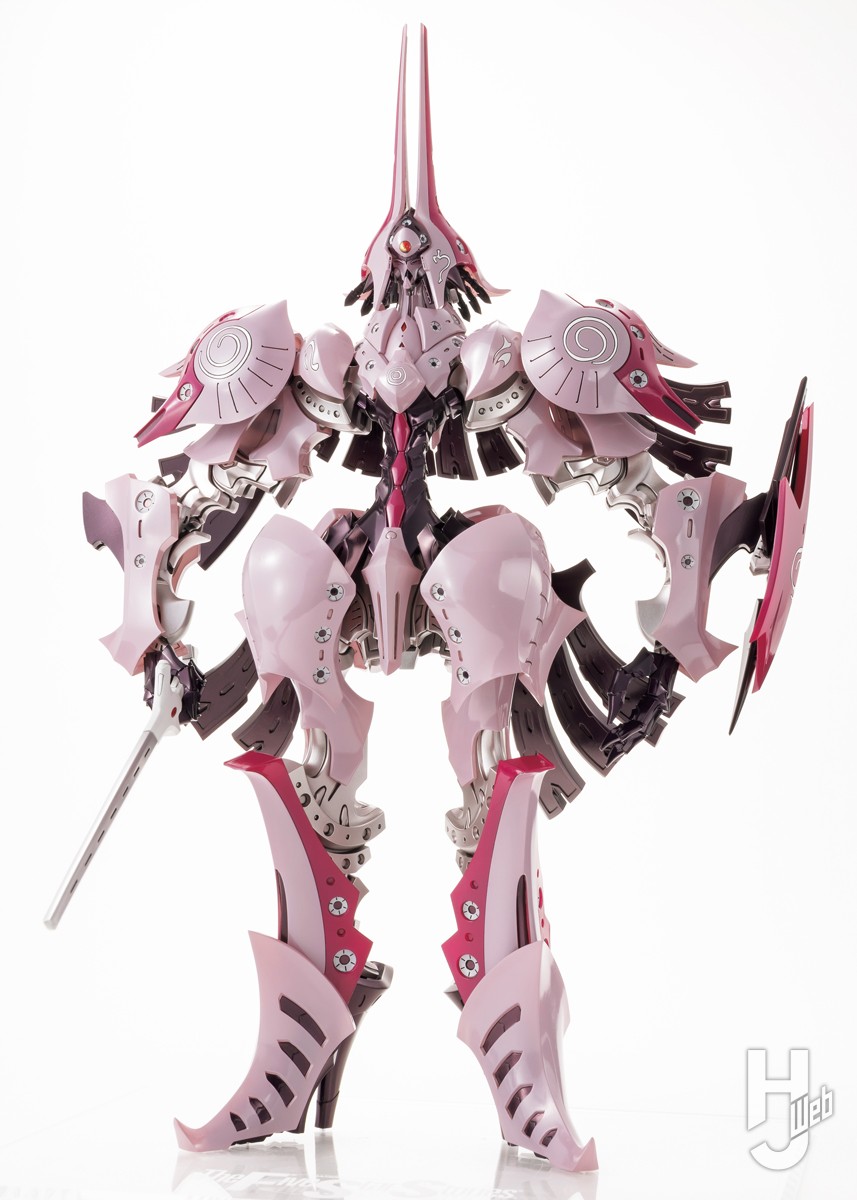 クラーケンベール大帝率いるメヨーヨ朝廷筆頭騎士団の主力GTM、ホウライがボークスのHSGKシリーズにラインナップ。パンター・フレームを持つGTMでは初の立体化となる本騎を、ベージュとクリアーの2色成型で再現。随所に施された呪術的な“ぐるぐるマーク”の紋様は、通常のものと手描きタッチの2種をデカールで用意。頭部外装や肩部バックシールド、背面放熱板、ガット・ブロウなど、設定画や劇中の仕様を選択式で再現可能とするなど、HSGKスタンダードなハイスペックな仕様となっている。