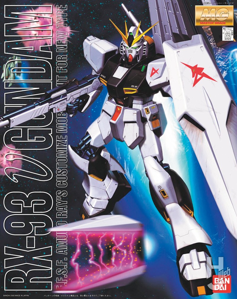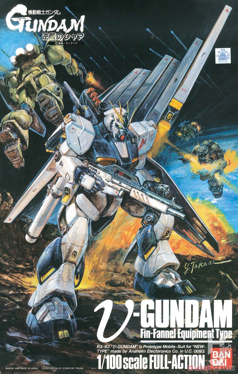 ▲1/100スケール初のνガンダムのプラキット。「FULL-ACTION」を謳い、ヒザ部シリンダーパーツからフィン・ファンネルにいたるまで可動にこだわった意欲作である。肩関節と股関節、スネ内部フレームにダイキャストパーツを用いることで、1/100ではそれなりの重量となるフィン・ファンネルを装着した状態でもしっかりと自立可能。高荷義之画伯が手掛けたボックスアートも印象的だ