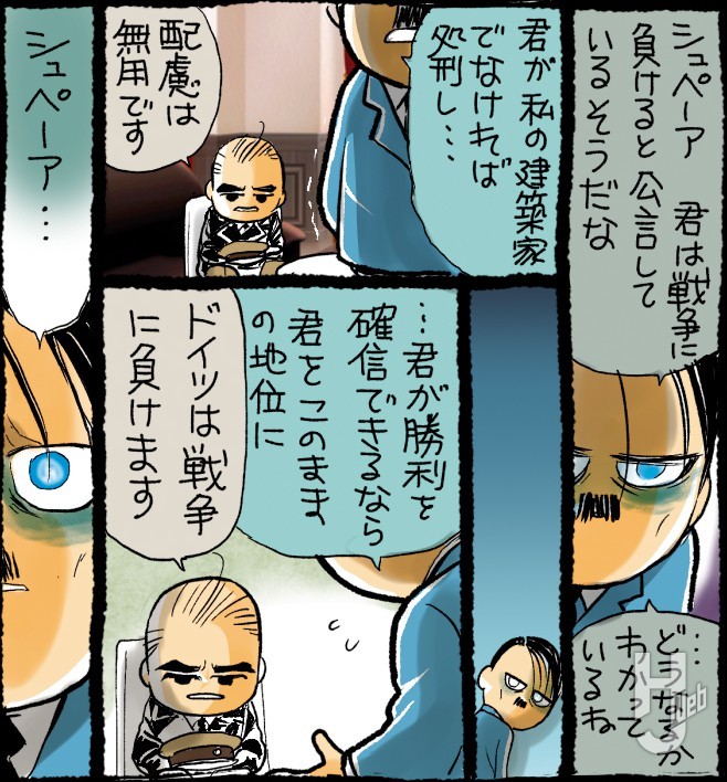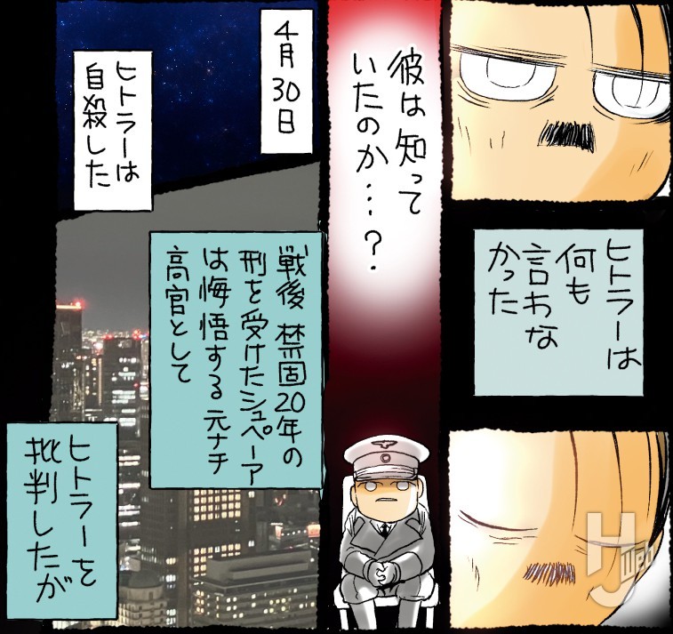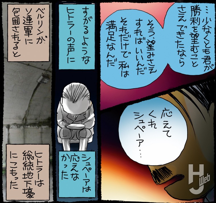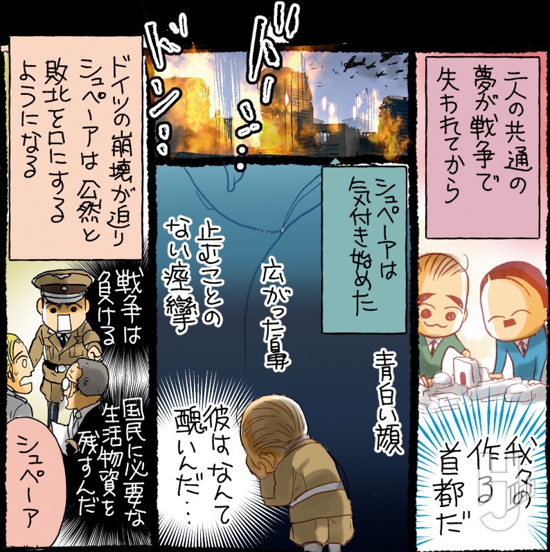 ドイツの崩壊が迫るとヒトラーは焦土作戦「ネロ命令」を下す。シュペーアは戦後のドイツのためにインフラを守ろうと命令を妨害した。大戦末期、シュペーアの忠誠は薄れたと思われたが、生涯ヒトラーの影に囚われていた。