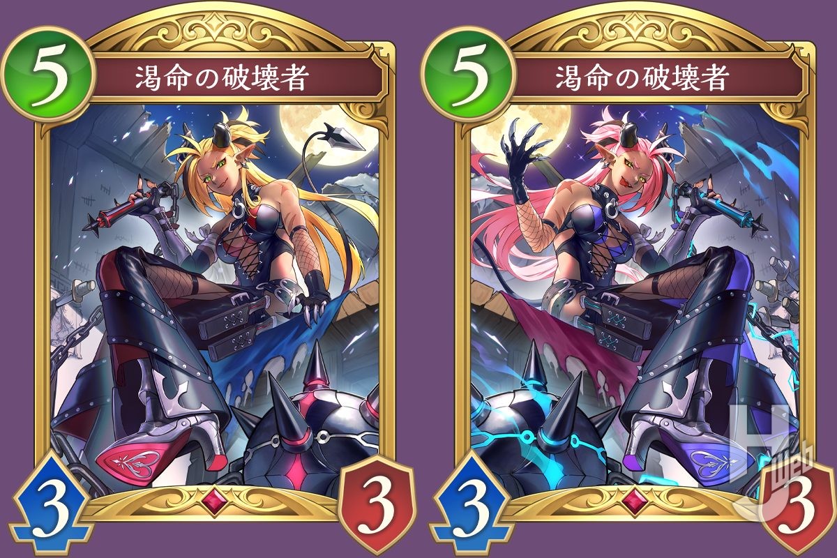本記事で紹介するのはナイトメアクラスの新フォロワー『渇命の破壊者』だ。コスト5に対し、攻撃と体力ともに3と、一見は少々心許ない値に見えるが、【ファンファーレ】の効果で真価を発揮する。【ファンファーレ】の効果で自身のフォロワー1体を破壊することで、コスト5で盤面に「5/5」と「3/3【ドレイン】」のフォロワーを一気に展開できるのだ。