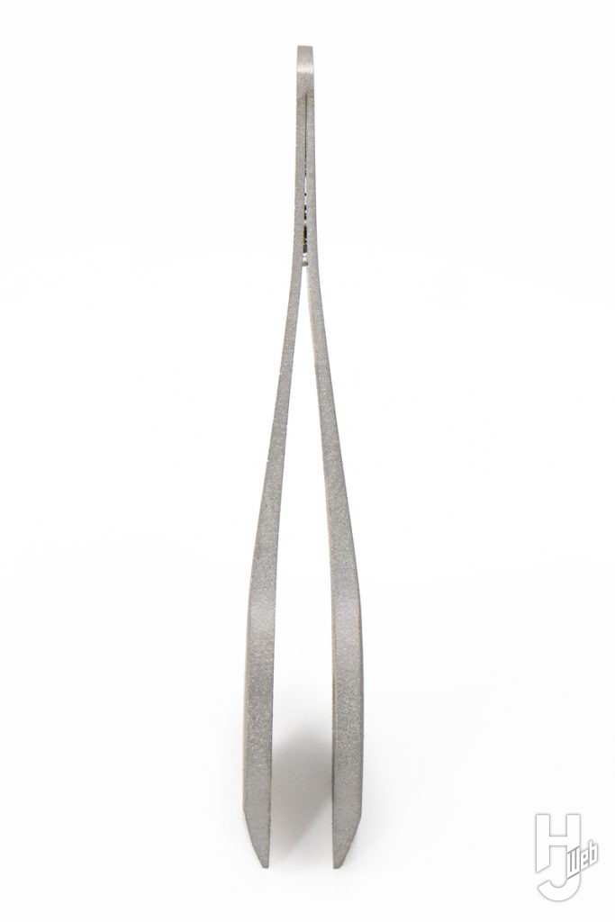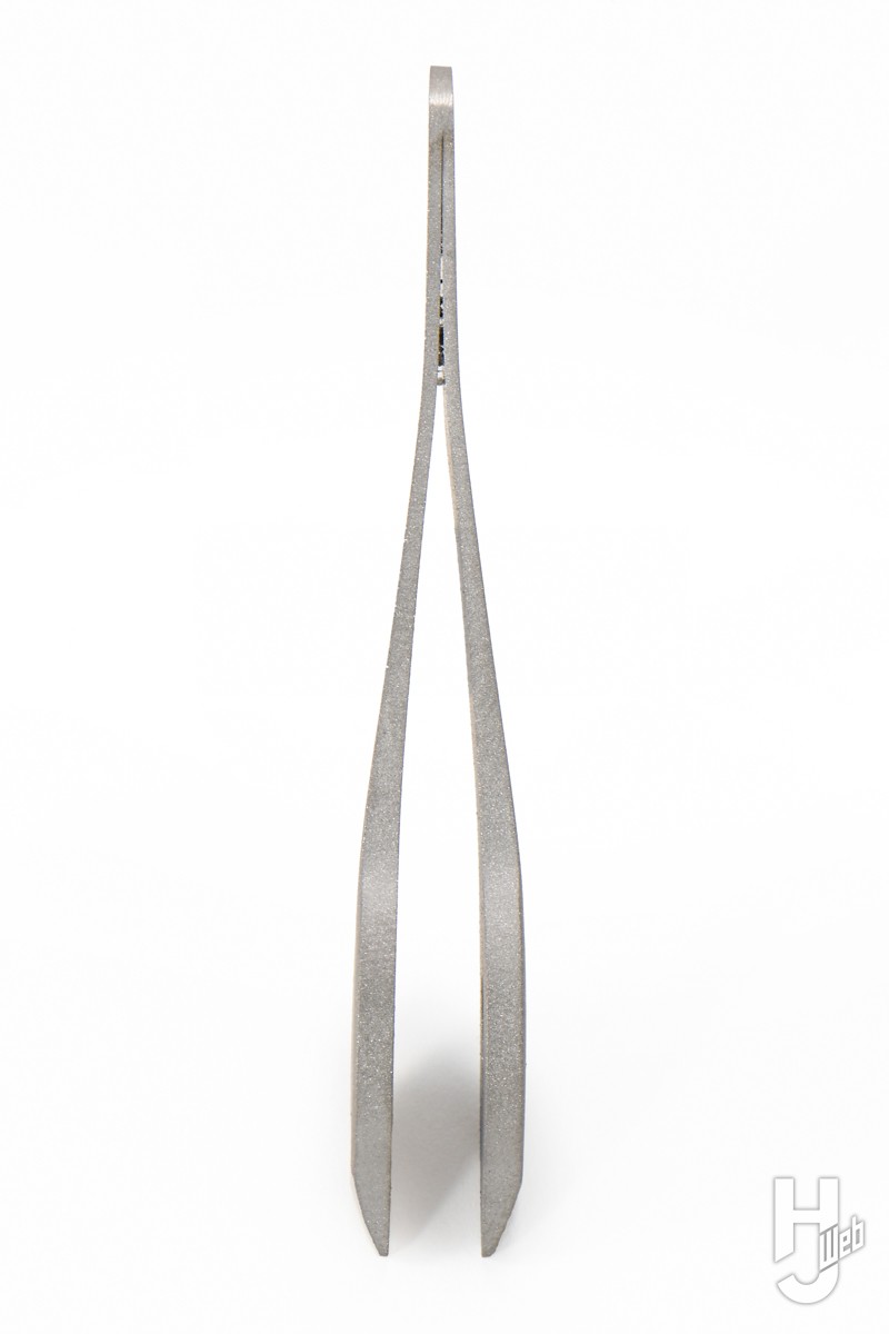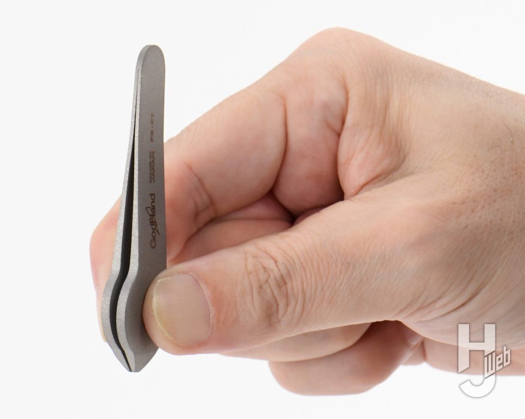 ▲指で押さえる箇所が前方にある小型のピンセット。厚みと幅のある先端で小パーツなどをしっかり保持できます