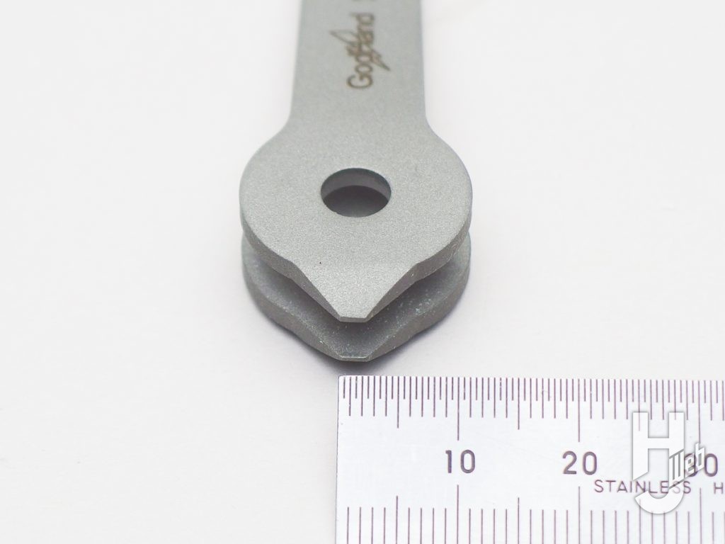 ▲先端は細い所が2mmほどの台形。全体にショットブラスト処理がされ、微細な凹凸が保持を助けます