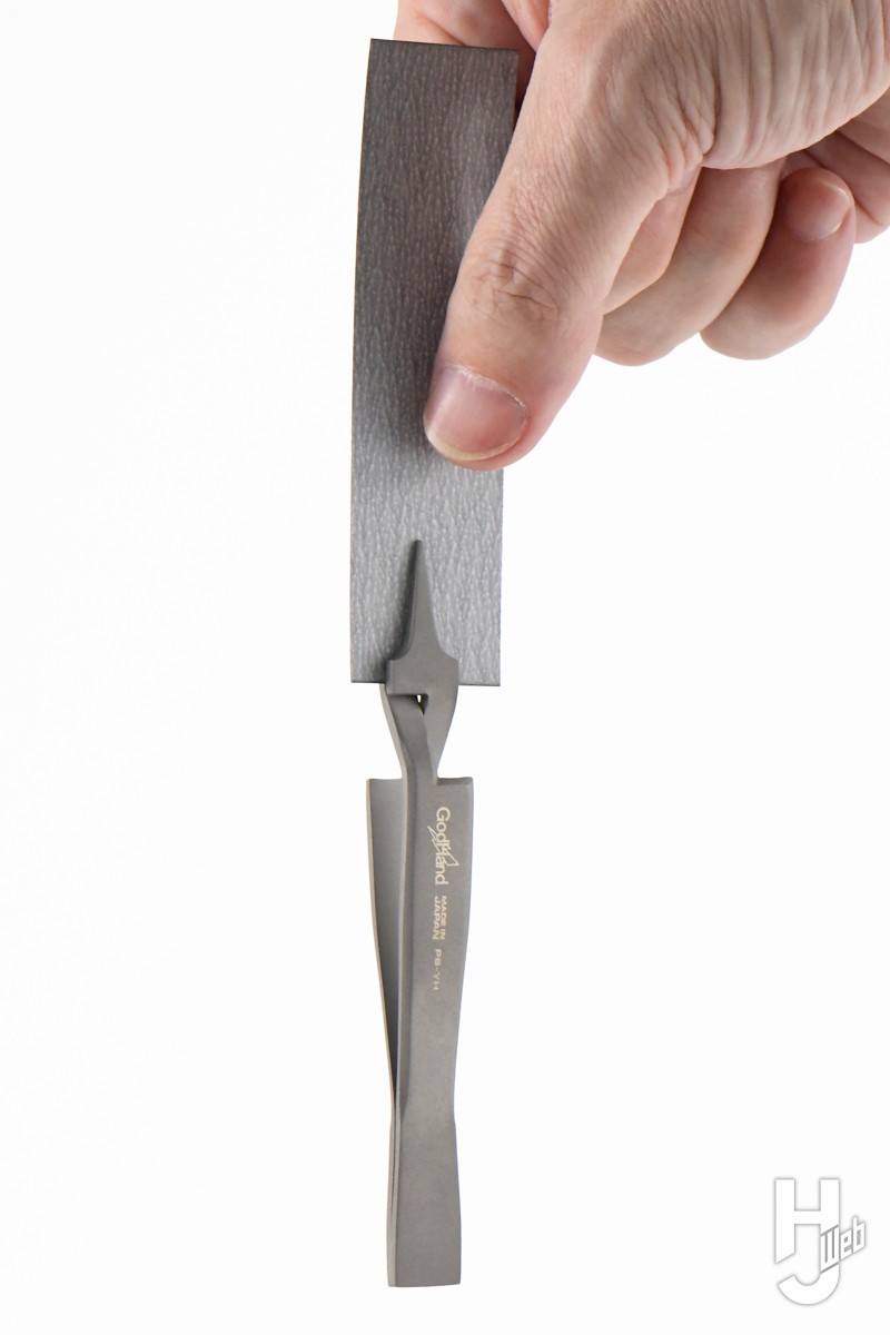 ▲強く保持する逆作用タイプのピンセット。先端が平らな面で接し、薄い対象物をしっかり固定。紙ヤスリなどを咥えて整形に使います