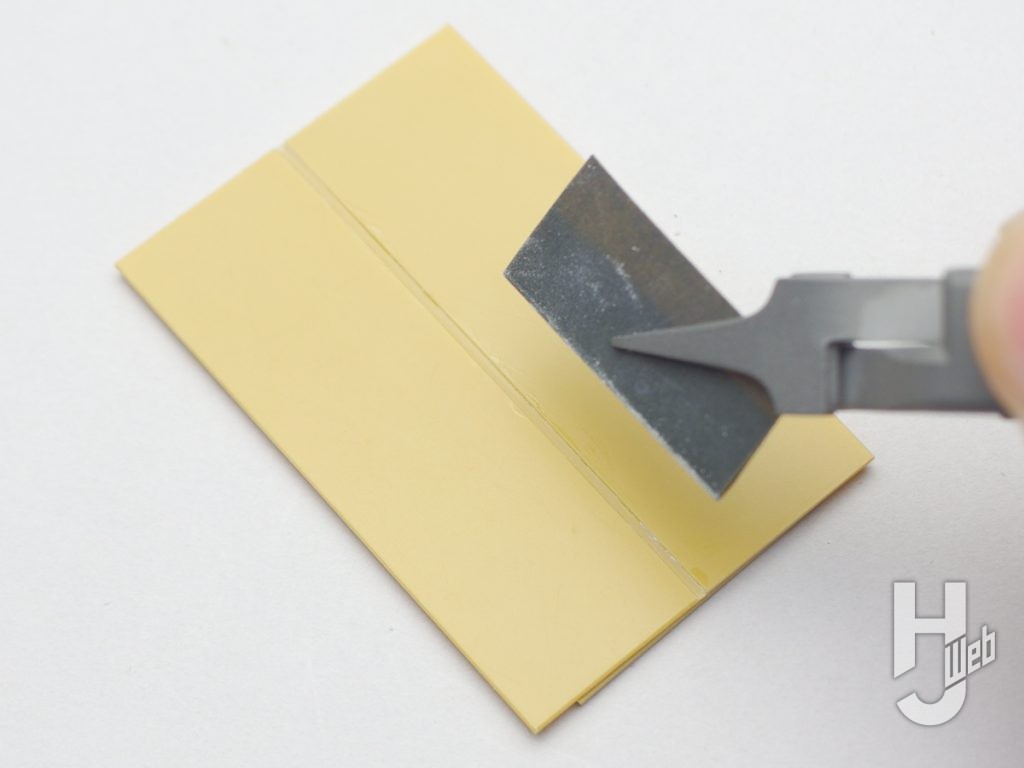 ▲スジ彫りやミゾ加工をしたケバ立ちを整えるのに、紙ヤスリのフチでなぞって整えることがあります。そんな例での活用を見ていきましょう。手頃な大きさに切った紙ヤスリを奥まで入れるように咥えます