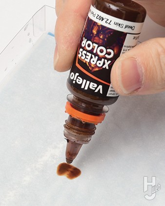 ▲ ①/今回のキャラクターの褐色肌や黒部分などはミニチュア塗装に最適なエクスプレスカラーを使います。まず肌部分をドワーフスキンで塗装していきます