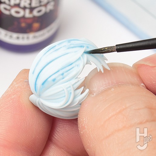 ▲ ⑧/仕上げに髪の毛をエクスプレスメディウムで割ったエクスプレスカラーのミスティックブルーをスミ入れ塗装