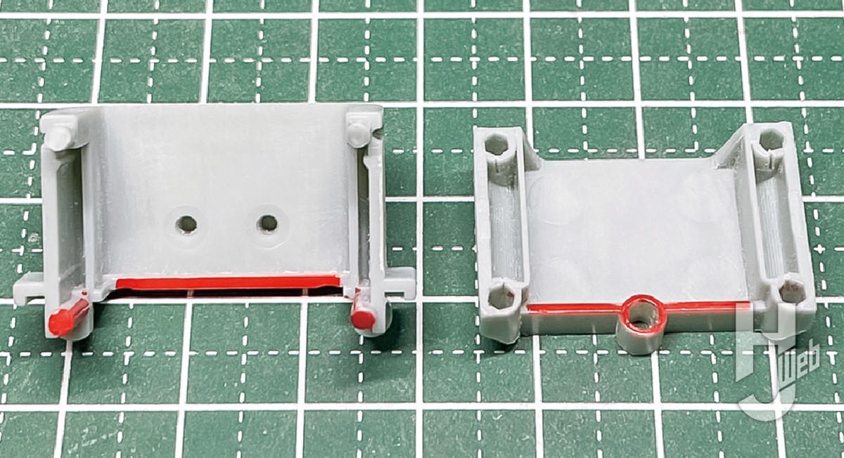 MODEROIDらしくはさみ込み構造が多用されているので、合わせ目を消すとなるとやや大変。バラせない箇所はパーツを入れたまま接着・塗装。具体的には肩関節(パーツB12・B13)がそうですね。関節パーツを組み込んだまま受け側の合わせ目を消し、塗装時は関節を動かしながら吹いて、塗り漏らしのないように塗っています。他、手首や足首の軸受けパーツも受け側とは成型色が異なりますが、完成時はほとんど見えなくなるので一気に塗っています。構造上、どうしても合わせ目処理が難しい箇所(スネと上腕ブロック)は、塗装後にパテを盛って表面処理してから合わせ目を接着、また塗るという力技で乗り切っています。