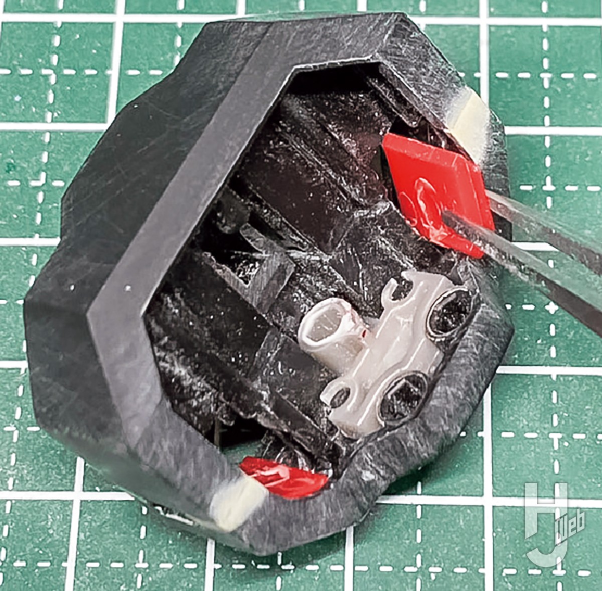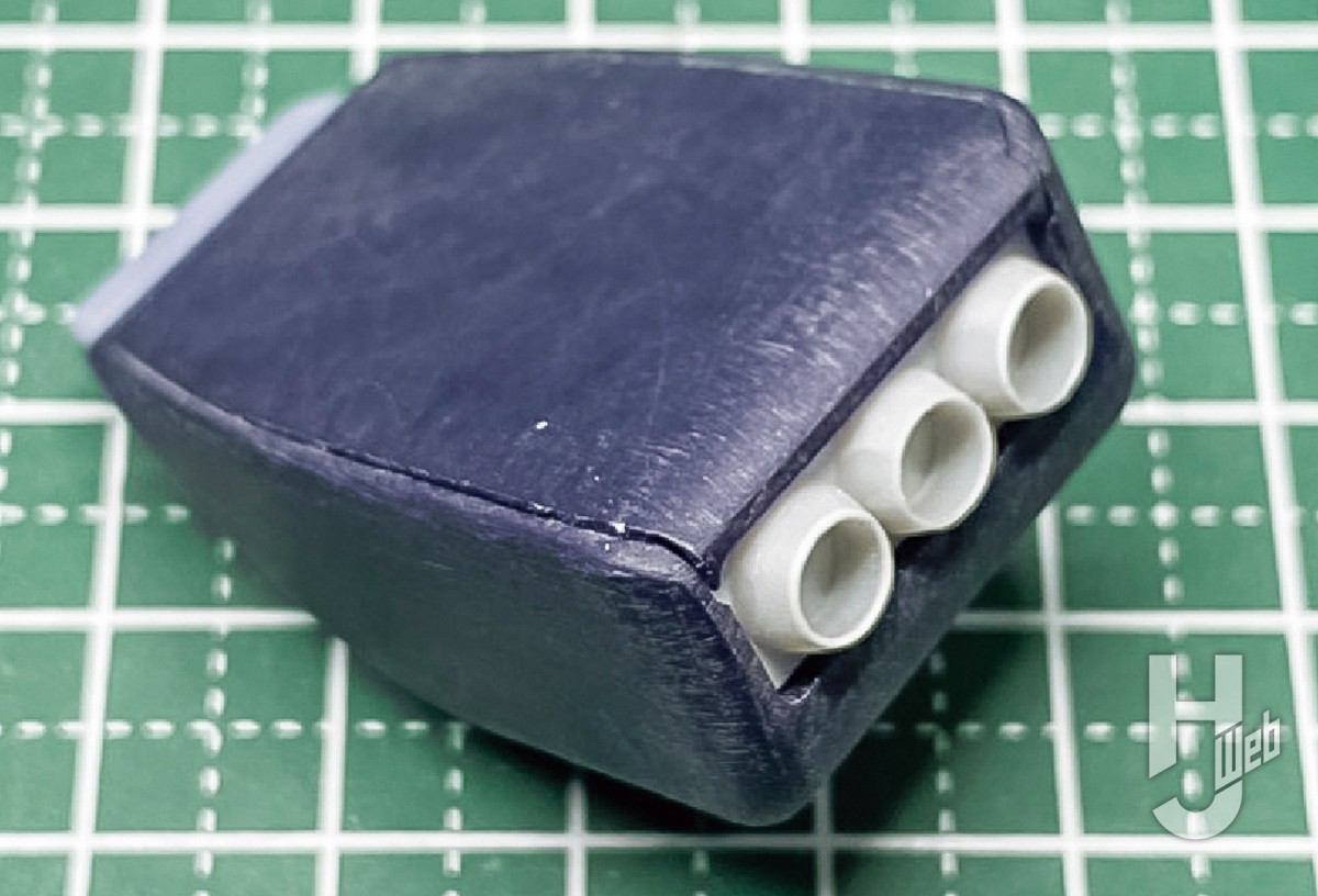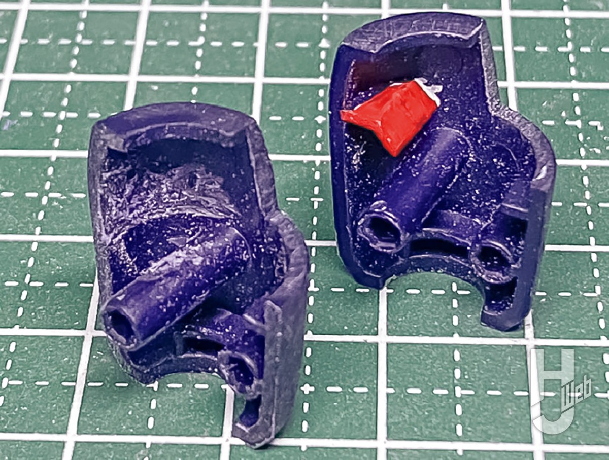 細かいところですが、ヒジ関節の縦スリットは成型都合でモールドが消えている箇所があるのでしっかり彫り直し。ハンドパーツの開き手や武器裏、ガードランチャーの角部分の肉抜き(合わせ目の大きい隙間)は、パテを擦り込んでから表面処理をし、面をしっかり出しました。
