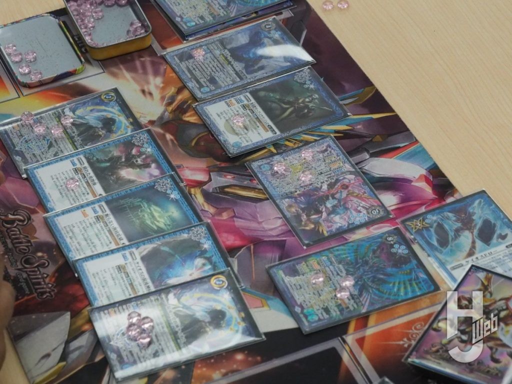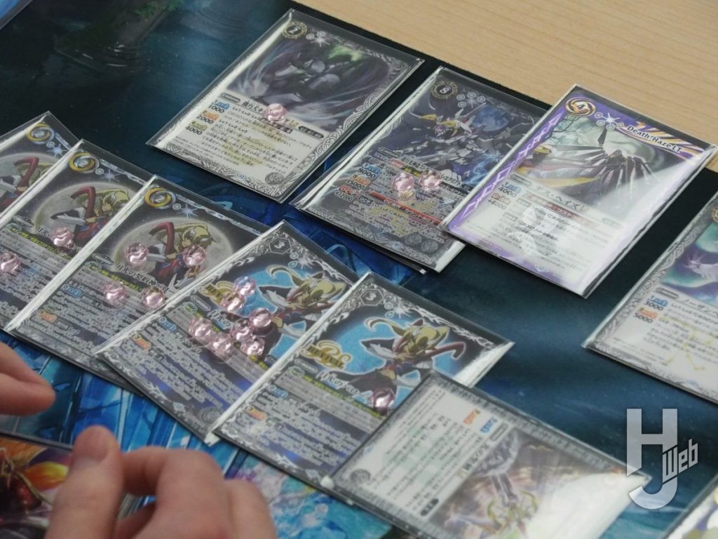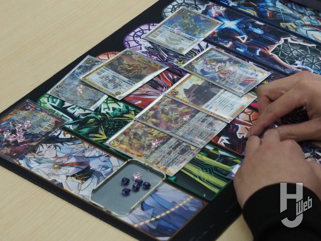 く:「弾神星」デッキを使用しました。今回、最新弾の『契約編:環 第4章 英雄傑集』が大会環境に加わるなかで「ケイオス」デッキを持ち込むバトラーが多いだろうと予想していました。そこで「ケイオス」デッキに勝つための方法を考えた時に、発売間もない状況で練度を高めにくい「ケイオス」デッキや新弾メインのデッキを使うよりは、使い慣れていて、相手の盤面が整う前に勝負を決められる早さもある「弾神星」デッキの方がよいだろうという結論になりました。