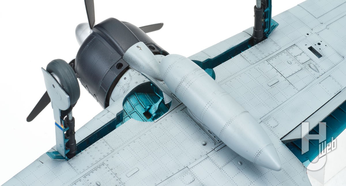 主脚、尾輪、着艦フックなどが可動するパーツ構成になっていますが、構造上無理があるのですべて固定したほうが良いでしょう。コクピット、尾輪、着艦フックをセットして胴体を完成させ、主尾翼を取り付けて外形はほぼ完成です。ここで照準器を取り付けますがガラス部分がクリアーパーツになっていません。そこで一度削り取って透明プラ板で再現しました。主脚柱は可動を意識したパーツ構成ですが、ここも厳しいと思いますので固定してしまったほうが良いでしょう。主脚カバーの一部にエッチングパーツを取り付けるようになっています。ただあまり意味がないのでプラパーツのままでも良かったのではないでしょうか。その上で胴体側の主車輪カバーが増槽との干渉を避けるため一部折れ曲がるようになっているのですが再現されていません。そこで一度切り取って接着し直します。カウルと胴体は塗装後に取り付けるのが良いでしょう。