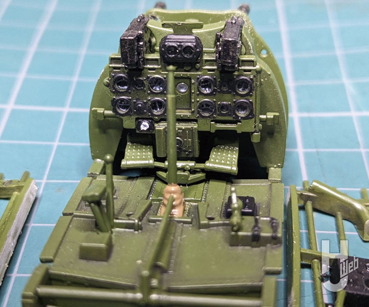 次にコクピットを組み立てます。クリアーで成型された計器盤の上からデカールを貼る指示がありますが、これではせっかくのクリアーパーツが台無しなのでクリアーパーツの裏にデカール糊を塗布してデカールを貼り、リアル感を出してみました。他の部位は、各パーツを塗装しながら組み立てます。完成後に気が付きましたが、座席が前過ぎました。しかし組立説明書どおりに組み立てたのでそのままです。