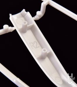 ▲似た形状の多いパーツを多数取り回す髪の毛状のパーツの裏にはパーツ番号がモールドされているので、パーツを切り離した後でも安心