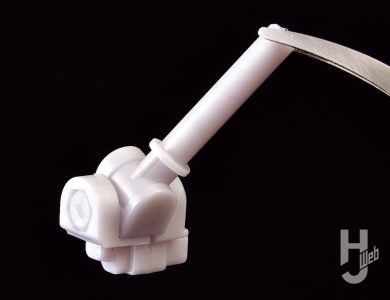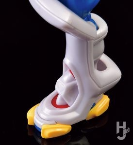 ▲キングゲイナーの靴はスネと一体化している。このデザインは非常に魅力的なものの、足首の可動範囲に影響を及ぼす。そこでPLAMAXでは足首関節軸を長~い棒として成型することで、足首自体を伸縮させて可動クリアランスを確保しているのだ