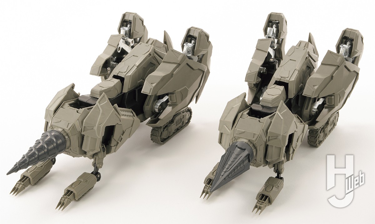 ▲ジェネシックガオガイガーの右脚になる「スパイラルガオー」(左)、左脚になる「ストレイトガオー」。設定通り後部が左右に大きく開くことで前後の幅が変わってメリハリのあるシルエットになる