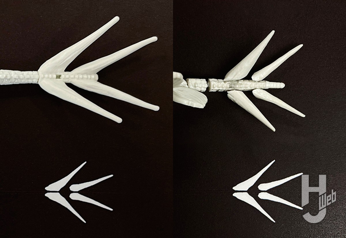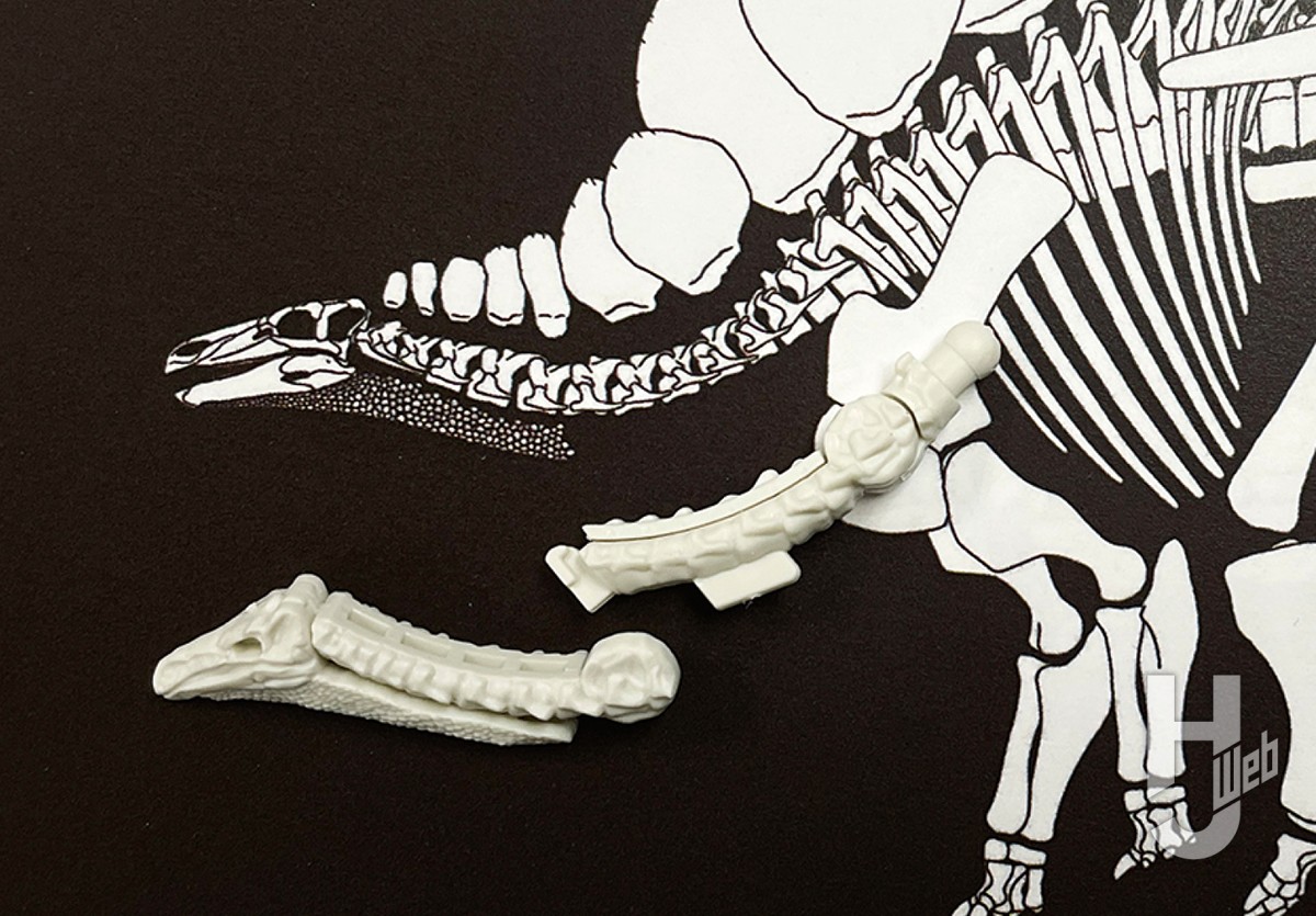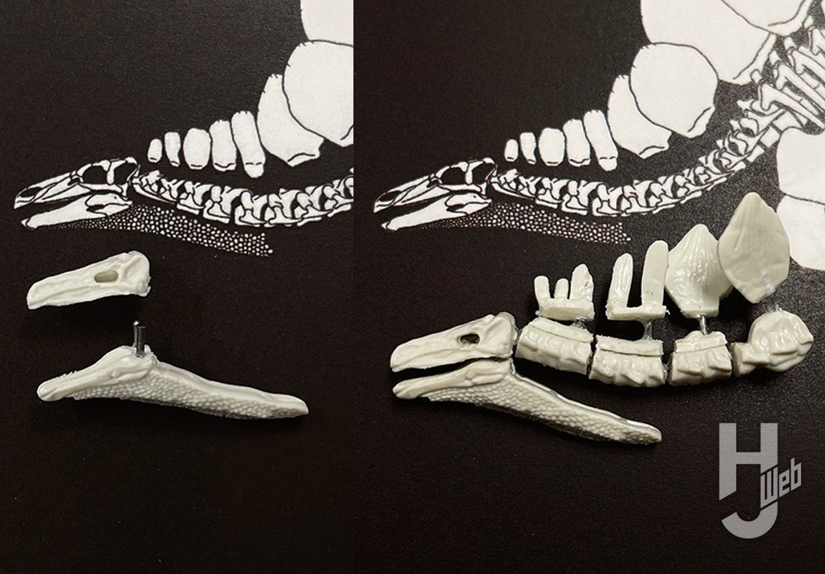 ▲キットの尾椎は全体的にはとてもよい雰囲気だ。成型の都合で一体となっている棘突起や血道弓はエッチングソーやデザインナイフで整形すると非常に見映えがする。また、プレートに合わせて要所要所で尾椎を切り分け、金属線を通して可動化する