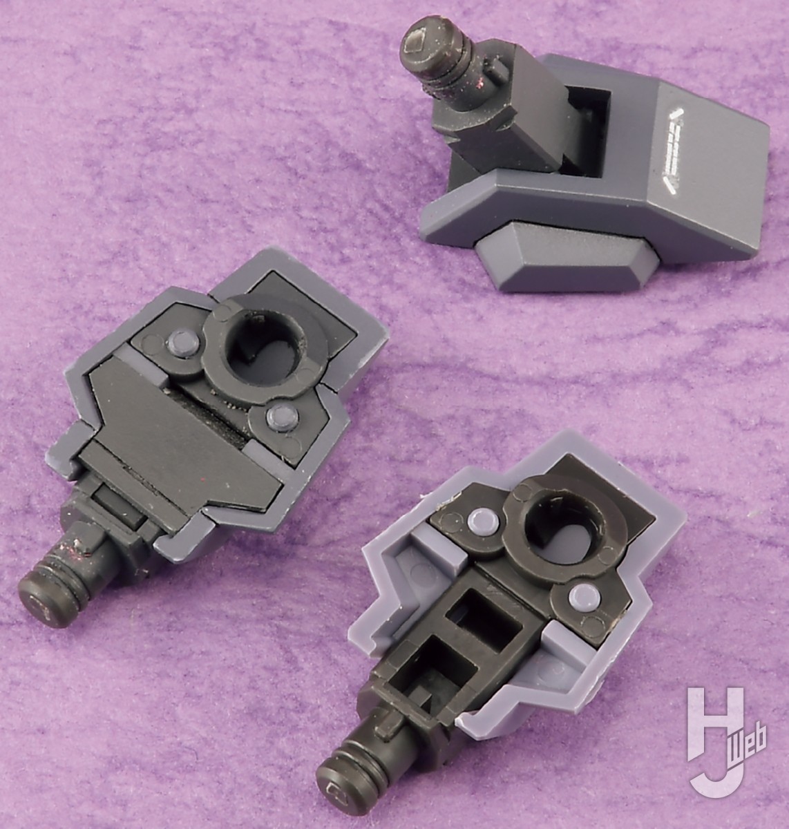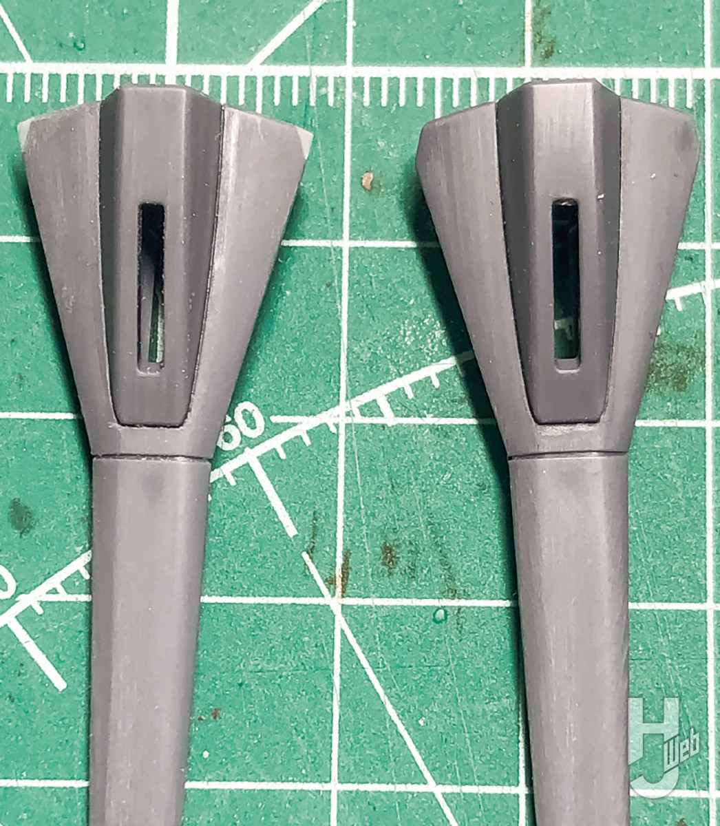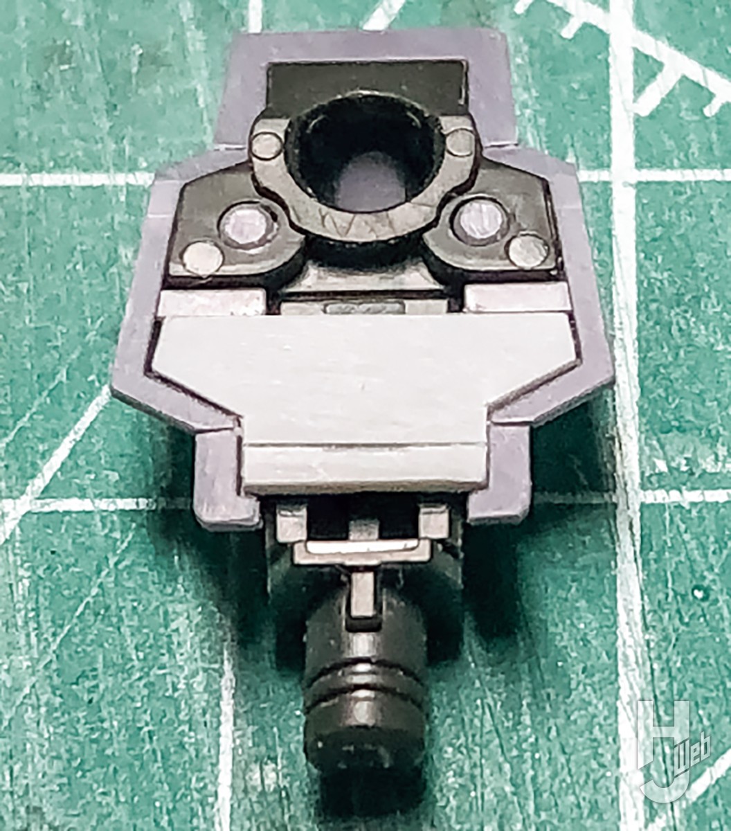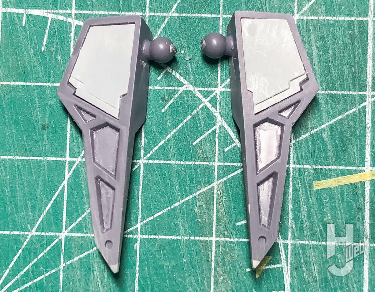 また重田氏のイラストを意識し、腹部側面のラインを変更しました。この際、腹部の左右回転可動にサイドアーマー基部が干渉するので、干渉部分をカットし整形しています。