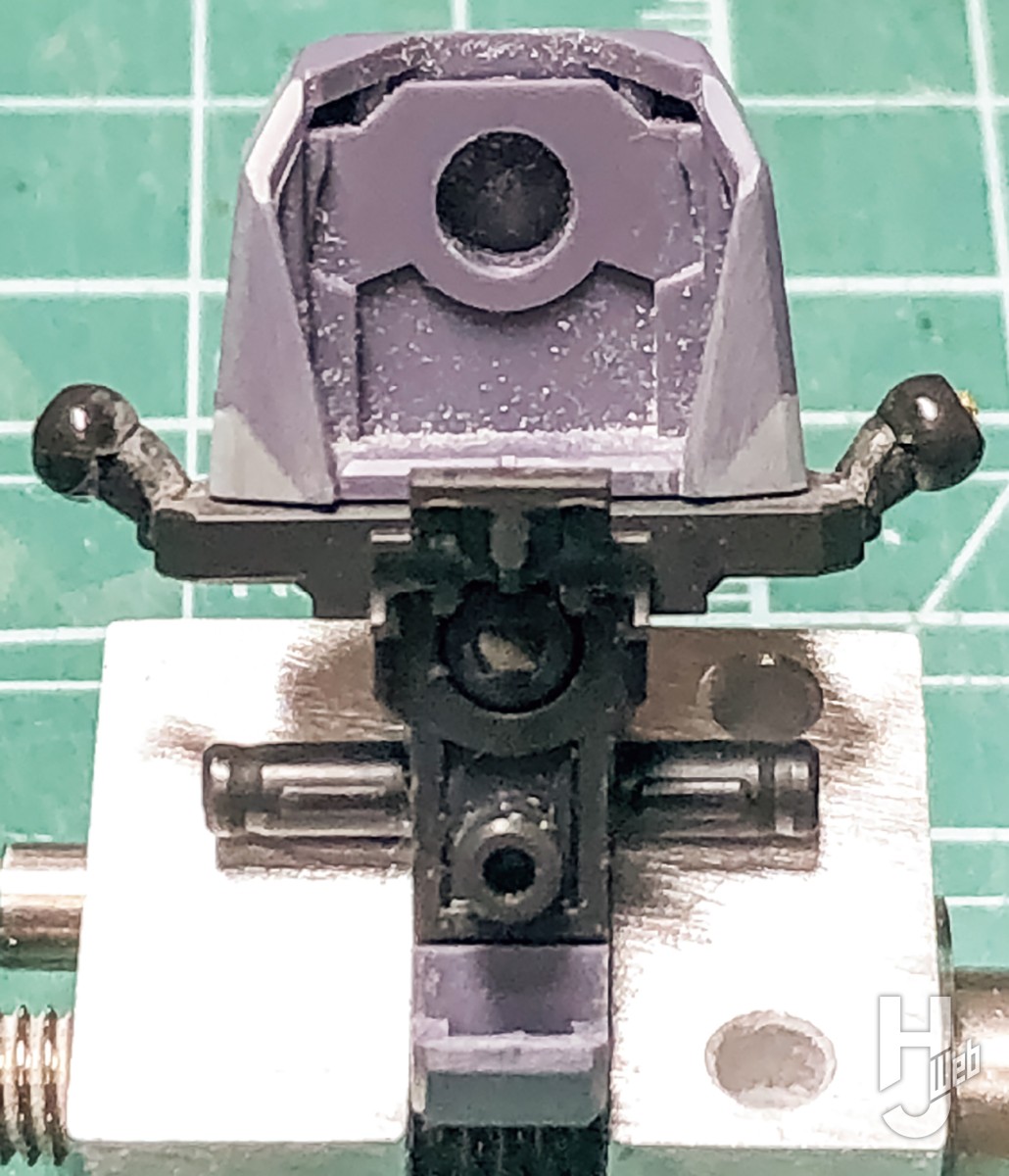 腹部の可動範囲が増えたことによりバックパック重量でのけ反ってしまうので、腹部可動軸を真鍮線とパーマネントマットバーニッシュを使用し強度を高めます。