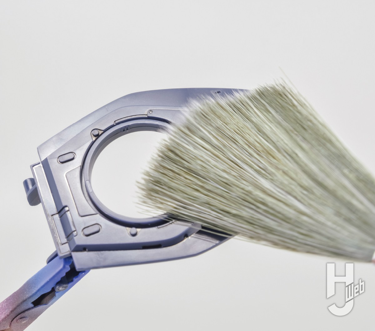 ▲ツヤ消しスプレーを吹く前に、タミヤのモデリングクリーニングブラシでしっかりと表面に付着したホコリやゴミを落とします。黒っぽいプラの上にゴミが付着すると特に目立つので入念に!