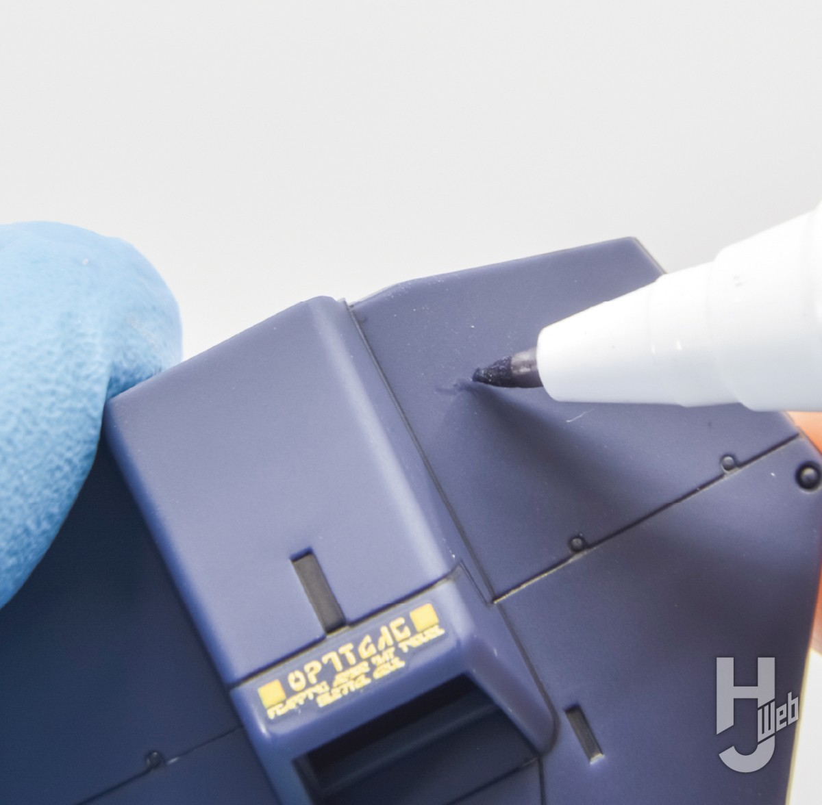 ▲水性なので、はみ出した時は指でさっと拭き取れます。下地のプラも黒いため、スミ入れの拭き取り汚れも目立たず、スムーズに作業することができます