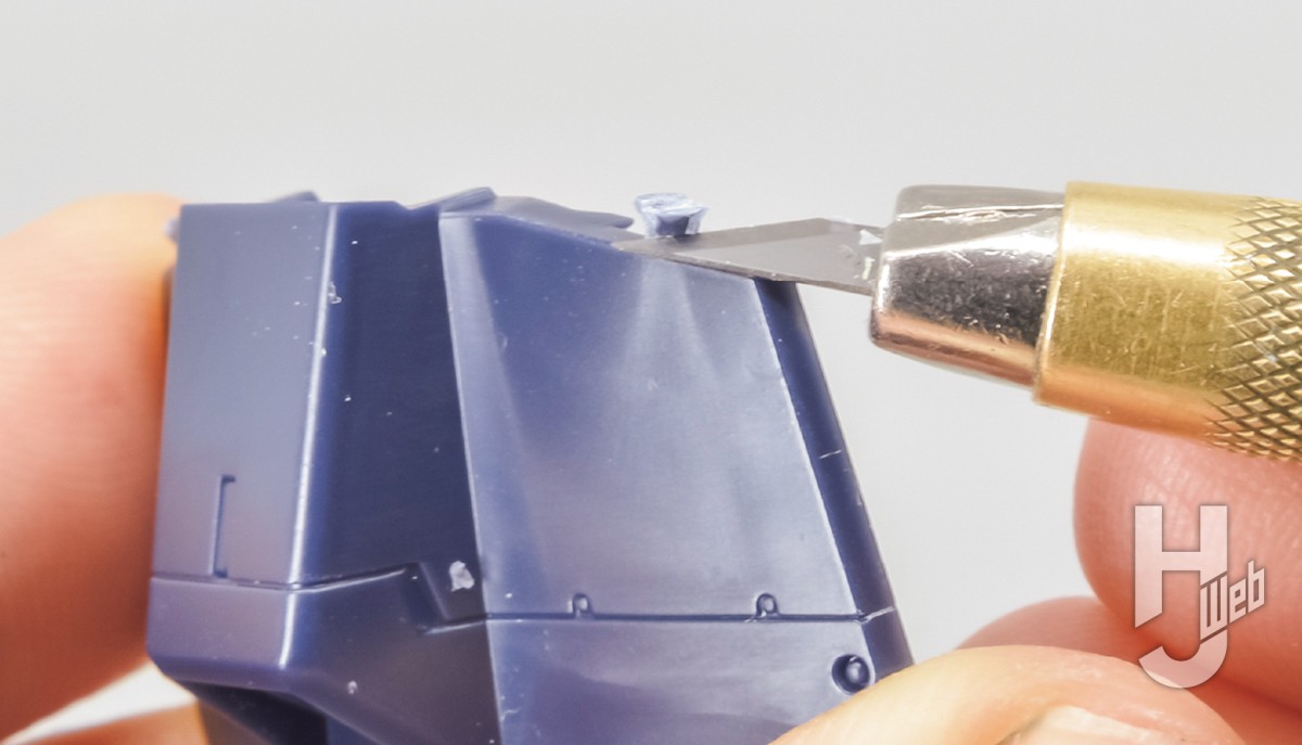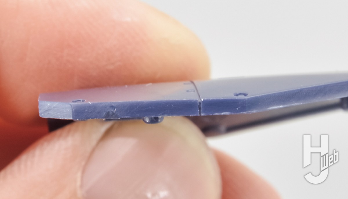 ▲この黒といった濃い色で成型されたパーツは、切り出し時にゲート跡が白くなる「白化」現象が起きることがあります。ニッパーの二度切りではなく、丁寧にナイフでゲートカットしましょう。切れ味のよい刃を使えば白化を大幅に抑えられます