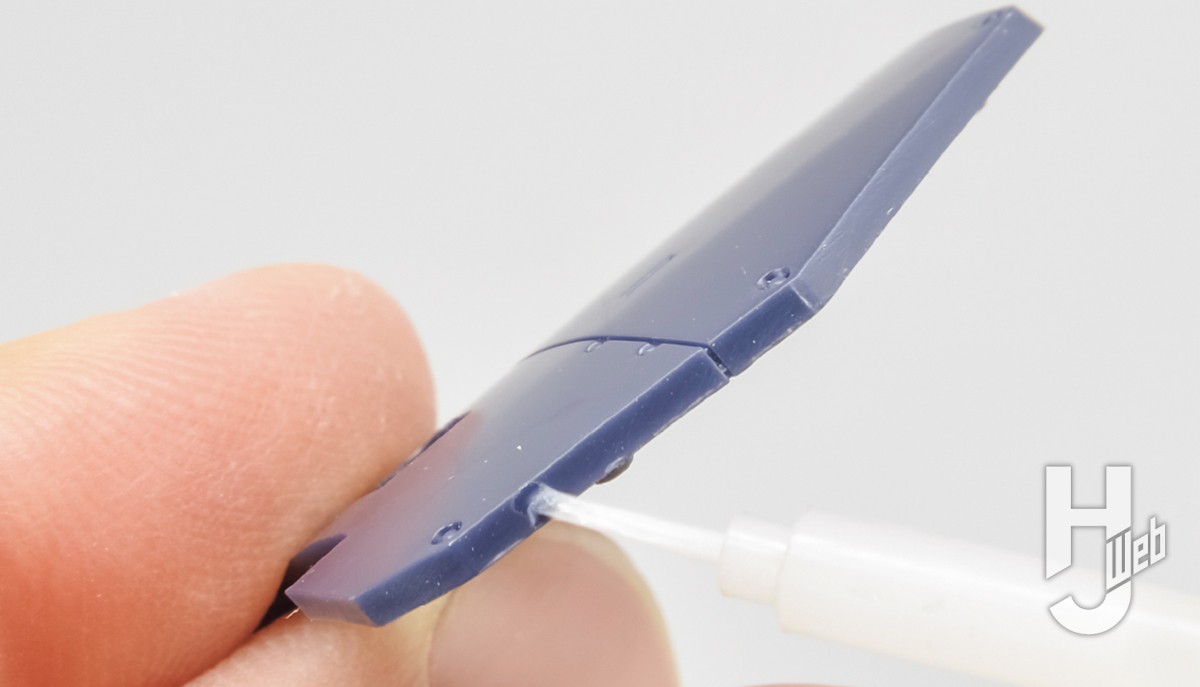 ▲白化部分に速乾流し込み接着剤を付けてわずかに溶かします。白化は強い力でパーツが変形したことで白く見えるために起こることであり、成型材の色自体は変わっていません。溶かして固め直すことで元の色に戻ります