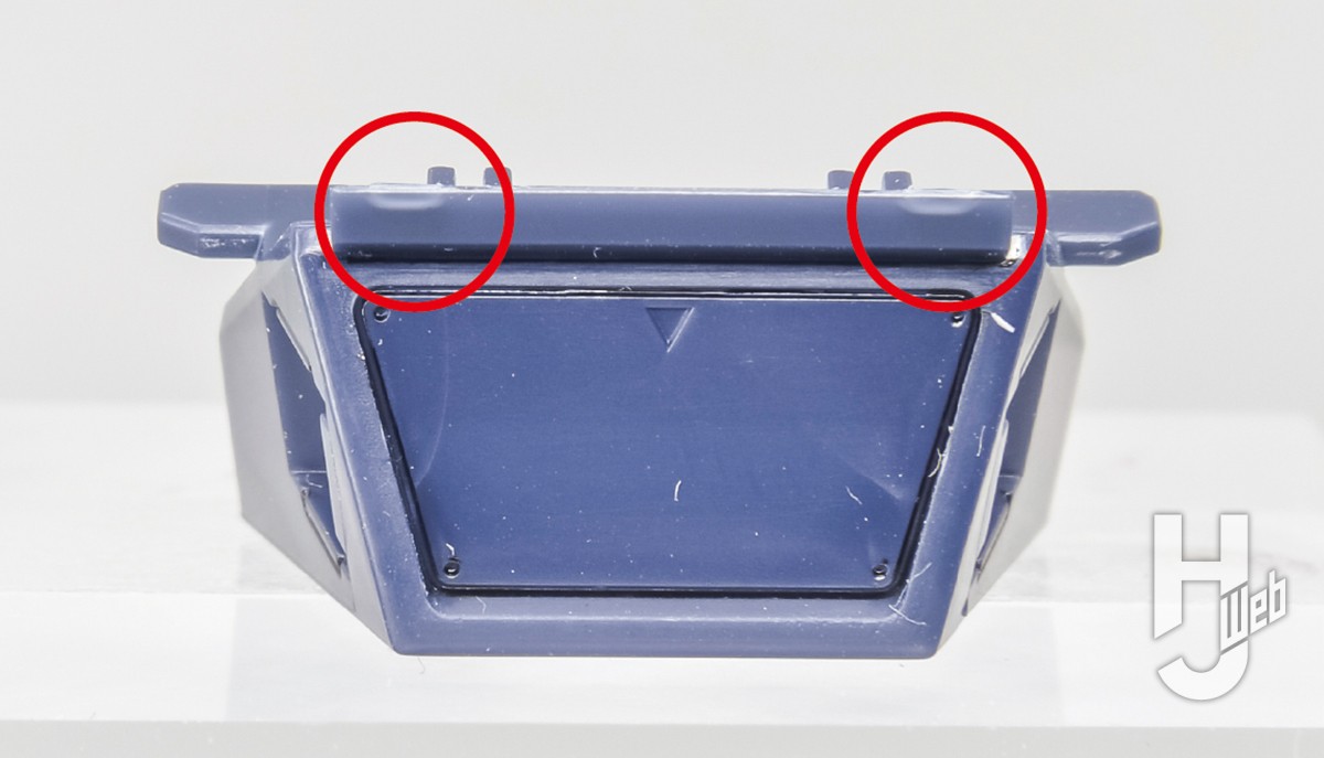 ▲黒い模型の宿命ですが、パーツによってはランナーに付いた状態ですでにゲートとの接続部が白化しており、かつ白化がパーツの内側から生じているため、接着剤で表面を溶かす方法では対応できないこともあります。この胴体正面のハッチ上部がその例です