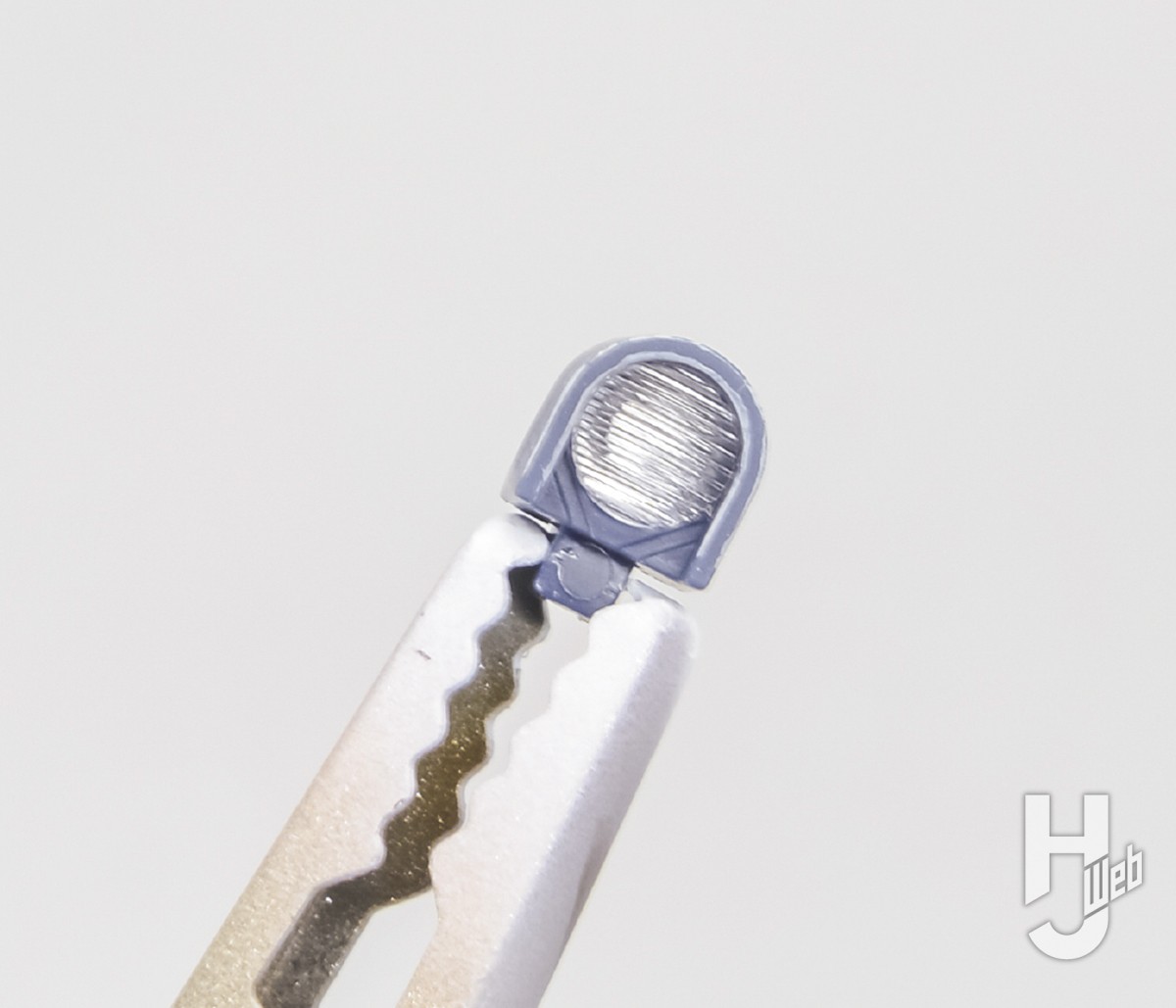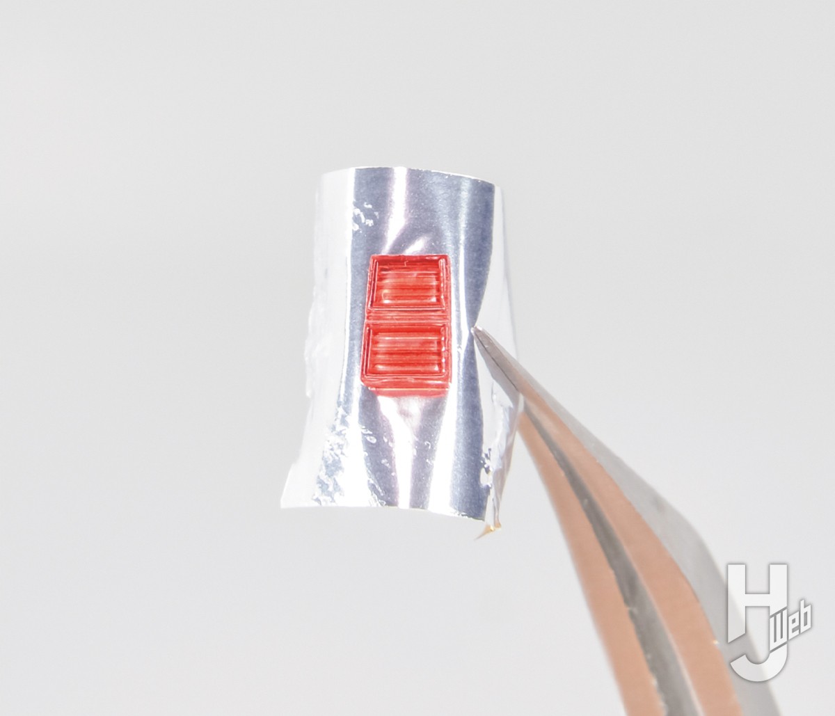 ▲クリアーパーツはそのまま装着すると裏が暗く沈んでしまい、せっかくのクリアーが目立たなくなってしまいます。ここは裏側からラピーテープなどのメタリックテープを貼っておきましょう。光が反射するため、発光しているかのような見え方に仕上がります