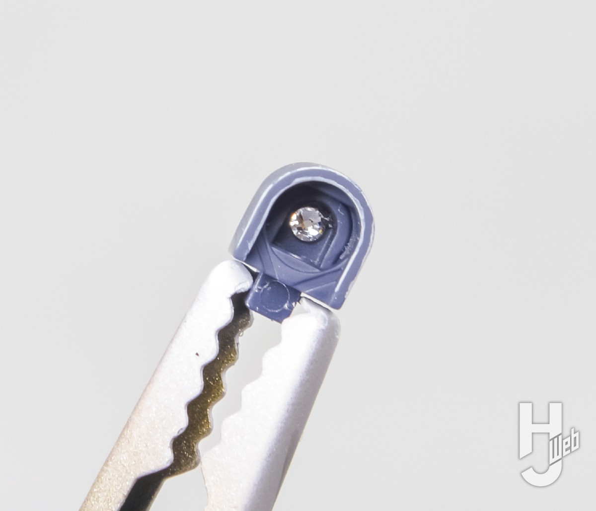 ▲胸部ライトも工夫してみましょう。構造上、レンズパーツ裏側にピッタリメタリックテープを貼るのは難しいので、奥にネイルアート用のラインストーンを貼り付けておきます。ラインストーンがライトとなり、外側から入る光をクリアーパーツ越しに反射し、本物のライト同様に光ります。裏側に最初からノリが付いているものを使うと貼り付けが楽なのでオススメ